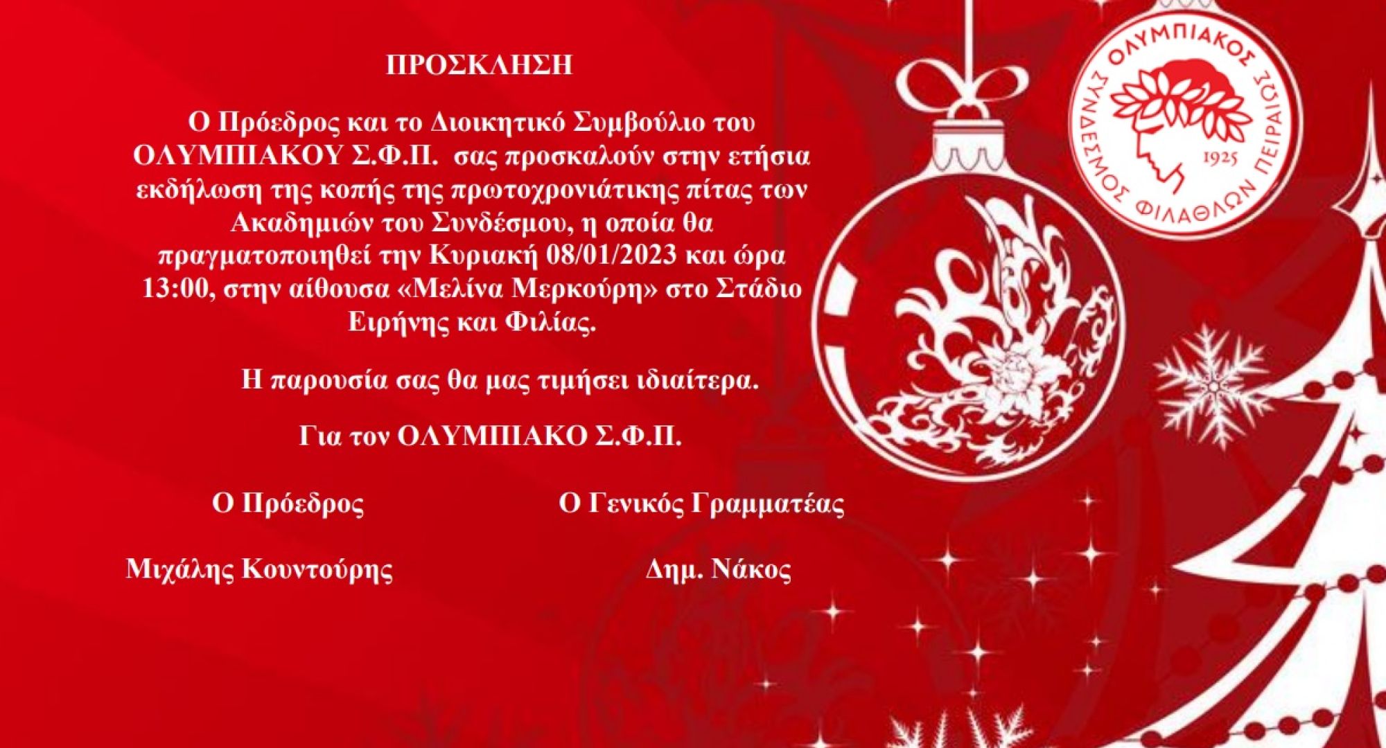 Λίγο πριν την επανέναρξη των μαθητικών τους υποχρεώσεων, οι αθλητές/ριες, μαζί με τους προπονητές και τους υπεύθυνους των «ερυθρόλευκων» Ακαδημιών του Ερασιτέχνη Ολυμπιακού θα ανταμώσουν στο Στάδιο Ειρήνης και Φιλίας για την κοπή της πρωτοχρονιάτικης πίτας. Πιο συγκεκριμένα, η αίθουσα «Μελίνα Μερκούρη» θα στολιστεί εορταστικά, για την εκδήλωση που θα λάβει μέρος την Κυριακή (8/1) στις 13:00, ενώ εκτός από την ανασκόπηση της περσινής χρονιάς που θα πραγματοποιηθεί, θα απονεμηθούν βραβεία σε όσους και όσες ξεχώρισαν με τις επιδόσεις τους στο 2022. Εκπλήξεις και δώρα περιμένουν όλα τα παιδιά, και ιδιαίτερα τους τυχερούς νικητές, που θα βρουν στο δικό τους κομμάτι ένα από τα φλουριά που έχουν τοποθετηθεί για κάθε τμήμα.