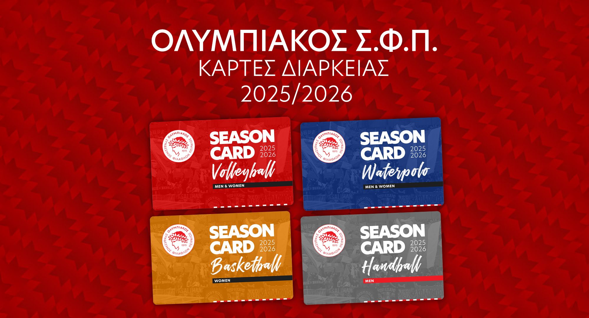 Ο ΟΛΥΜΠΙΑΚΟΣ Σ.Φ.Π. ενημερώνει τους φιλάθλους και τα Μέλη του ότι ξεκίνησε η διάθεση των καρτών διαρκείας για τη σεζόν 2025-2026 στα τμήματα Βόλεϊ Ανδρών & Γυναικών, Πόλο Ανδρών & Γυναικών, Χάντμπολ Ανδρών και Μπάσκετ Γυναικών.