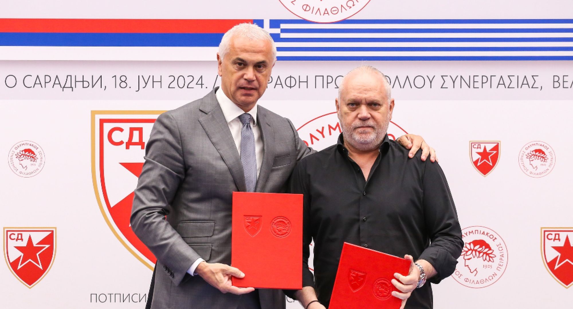 Ιστορικό πρωτόκολλο συνεργασίας υπέγραψαν ο Ολυμπιακός και ο Ερυθρός Αστέρας, ενόψει των εορτασμών των 100 και 80 χρόνων των δύο συλλόγων, αντίστοιχα, το 2025. Την Τρίτη (18/6) το μεσημέρι, ο Πρόεδρος του Ολυμπιακού Σ.Φ.Π., Μιχάλης Κουντούρης, έδωσε το «παρών» σε εκδήλωση στο Βελιγράδι, ανακοινώνοντας μαζί με τον Πρόεδρο του Ερυθρού Αστέρα, Ζβέζνταν Τέρζιτς, τη συμφωνία συνεργασίας.