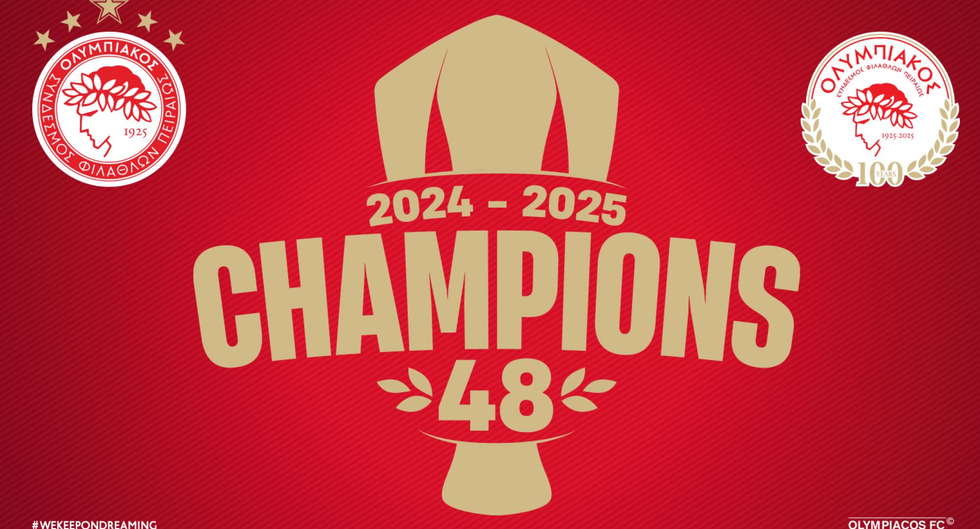 Συγχαρητήρια στον Κυπελλούχο Ευρώπης Ολυμπιακό μας για την κατάκτηση του 48ου πρωταθλήματος στο ποδόσφαιρο! Σε μια χρονιά-ορόσημο για τα 100 χρόνια του Ολυμπιακού, η νέα αυτή κορυφή έρχεται να προστεθεί στο μεγαλείο μιας οικογένειας που συνεχίζει, αδιάκοπα, να γράφει ιστορία σε κάθε άθλημα, ως ο κορυφαίος πολυαθλητικός σύλλογος της Ευρώπης.