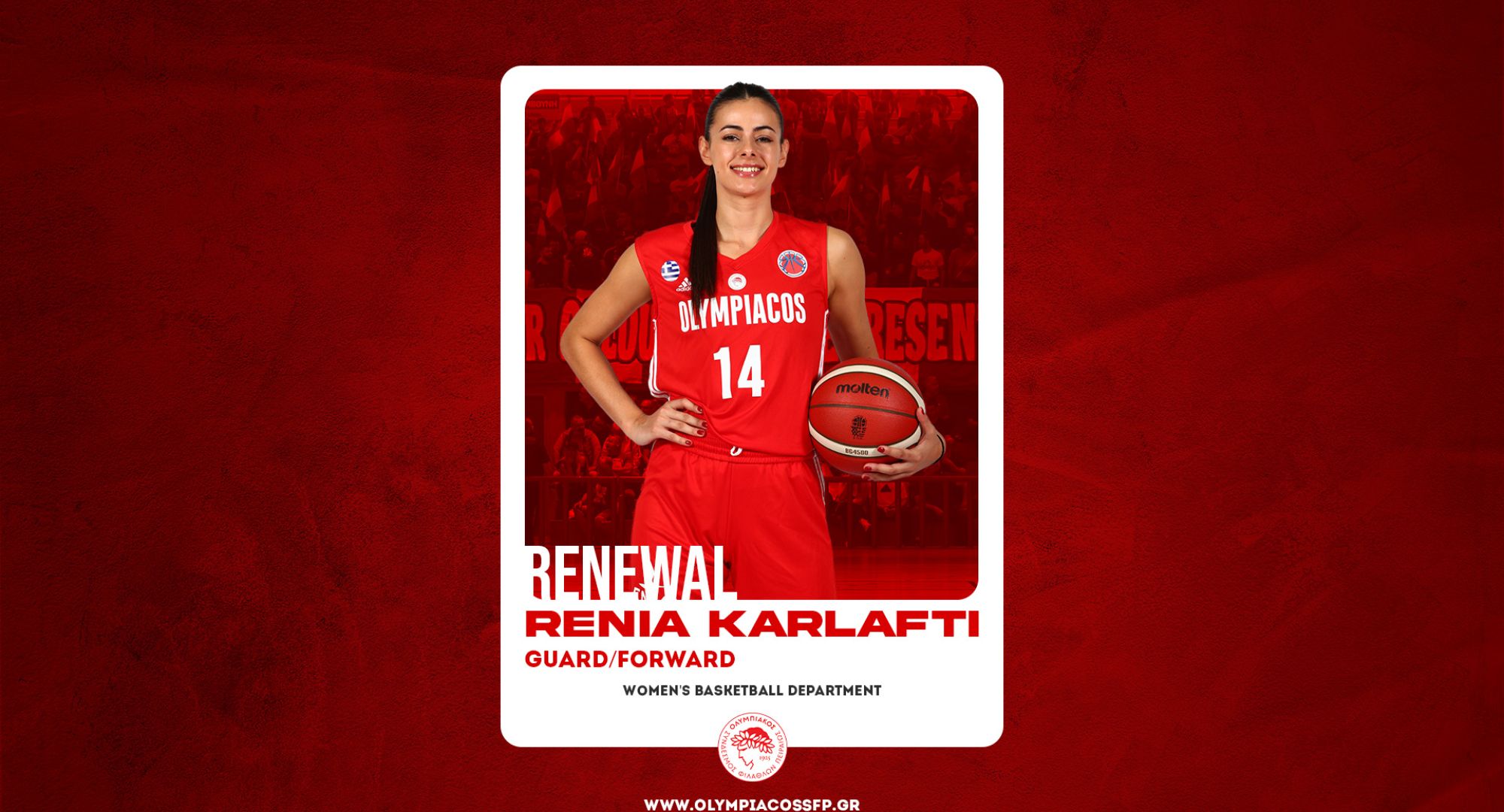 Ο ΟΛΥΜΠΙΑΚΟΣ Σ.Φ.Π. ανακοινώνει την ανανέωση της συνεργασίας του με την Ρένια Καρλάφτη. Η διεθνής γκαρντ/φόργουορντ υπέγραψε το νέο της συμβόλαιο, διετούς διάρκειας και παραμένει στο ρόστερ της ομάδας μπάσκετ Γυναικών του συλλόγου.