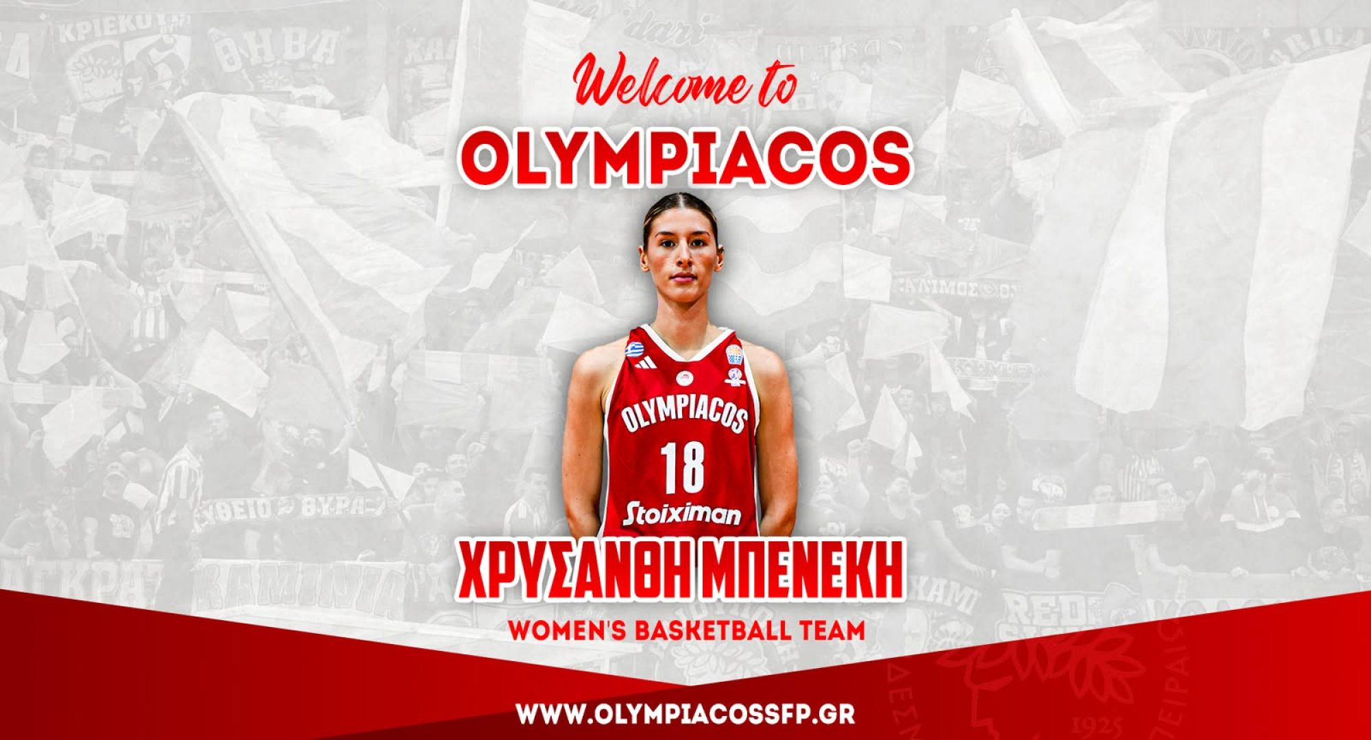 Ο ΟΛΥΜΠΙΑΚΟΣ Σ.Φ.Π. ανακοινώνει την έναρξη της συνεργασίας του με την Χρυσάνθη Μπενέκη. Η 24χρονη φόργουορντ (ημ. γέννησης 28/8/2001, 1,86μ.) υπέγραψε το νέο της συμβόλαιο και εντάσσεται στο ρόστερ της ομάδας μπάσκετ Γυναικών του συλλόγου.
