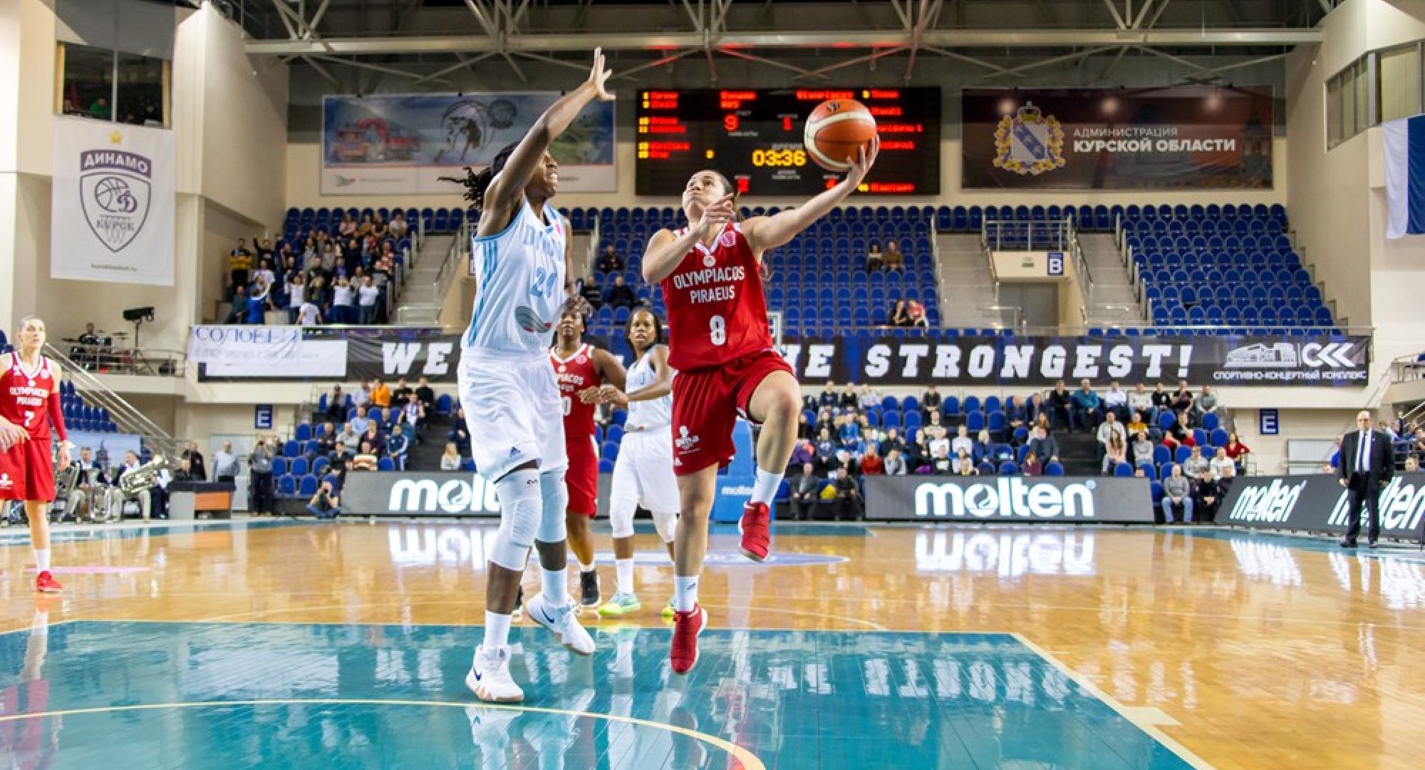 Ο Θρύλος ήταν άστοχος στο πρώτο δεκάλεπτο και βρέθηκε πίσω στο σκορ με 5 πόντους στο πρώτο δεκάλεπτο, όμως από τα 6,75μ αλλά και με παιχνίδι στο «ζωγραφιστό», πέρασε αρκετές φορές μπροστά στο δεύτερο δεκάλεπτο και πήγα αποδυτήρια όντας μόλις έναν πόντο πίσω. Η Dynamo Kursk ανέβασε την πίεσή της στην άμυνα, η Στιούαρτ με την Πέτροβιτς δημιούργησαν ρήγματα και ανέβασαν την διαφορά στους 11 πόντους. Ο Ολυμπιακός προσπάθησε να επιστρέψει στο σκορ, αλλά οι γηπεδούχες είχαν βρει ρυθμό και η Στιούαρτ είχε πάρει μπρος για τα καλά, με αποτέλεσμα να έρθει η ήττα.