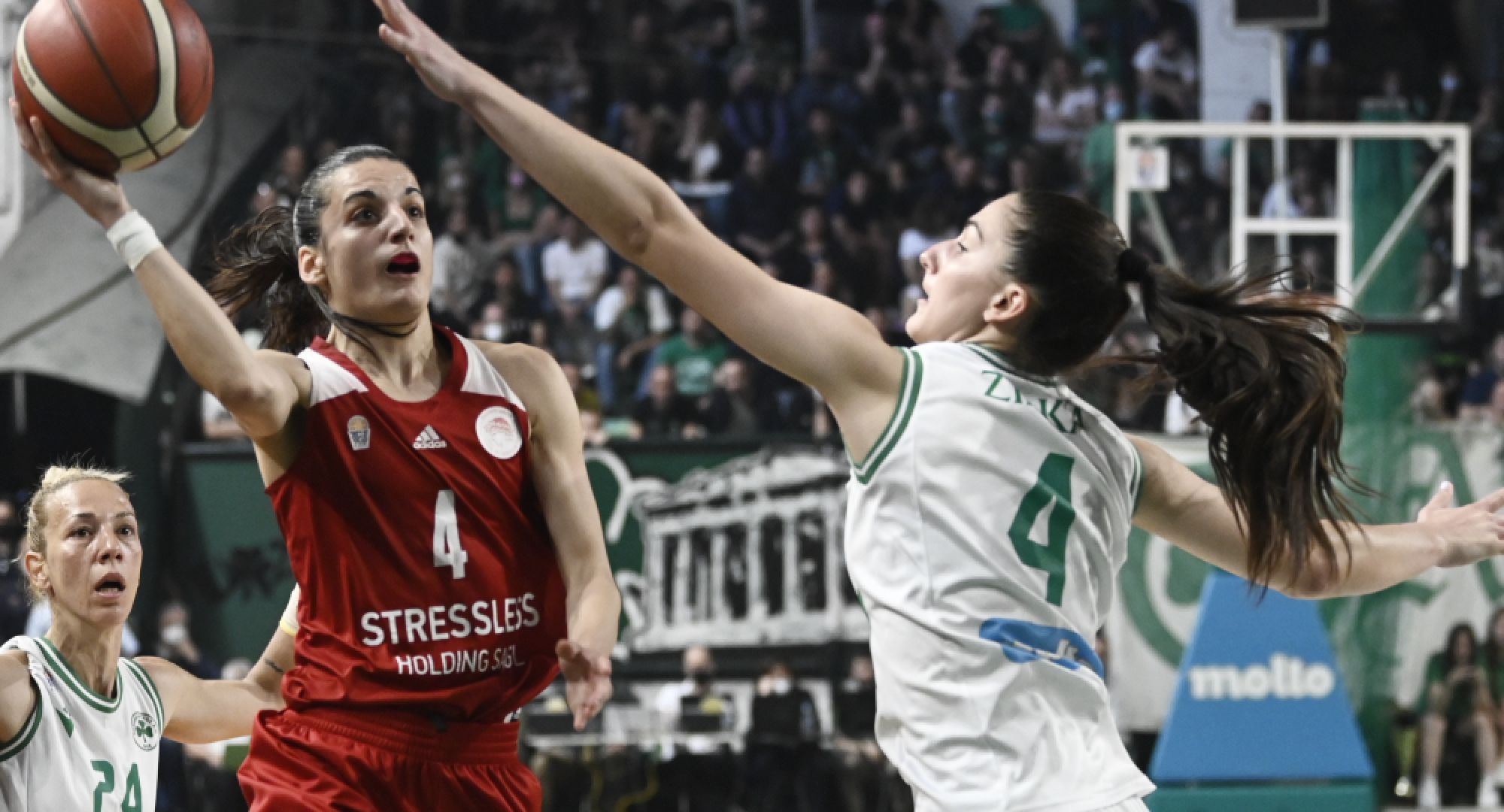 Στο 8:04 του τρίτου δεκάλεπτου, ο Ολυμπιακός ξέφυγε με +3 (33-36) από τις «πράσινες», με τρίποντο της Αλεξανδρή, με την Πλουφ να κρατά τη διαφορά, κάνοντας το 38-35, με λέι απ. Η Νικολοπούλου «έγραψε» το 40-37 για τον Θρύλο, όμως ο Παναθηναϊκός, με σερί 6-0, προηγήθηκε με 43-40. Η Χάμπλιν μείωσε σε 43-42 για τις «ερυθρόλευκες», οι οποίες δέχθηκαν τρίποντο από την Λύμουρα (0:04) και η τρίτη περίοδος ολοκληρώθηκε με 46-42 υπέρ των γηπεδούχων. Στο ξεκίνημα του τέταρτου δεκάλεπτου (8:02), η ομάδα μας ισοφάρισε σε 46-46, με τζαμπ σουτ των Σταμάτη και Νικολοπούλου και στη συνέχεια, σε 48-48, με την Πλουφ (4:51), με την Βίτολα να κάνει το 50-48 κόντρα στον Παναθηναϊκό στο 4:22. Οι «πράσινες» ισοφάρισαν (50-50), με δύο ακόμα βολές της Ριντ, με την Σταμάτη να δίνει προβάδισμα στον Ολυμπιακό με 53-52 (2:17). Στη συνέχεια, τα κορίτσια του Θρύλου «κόλλησαν» επιθετικά, δέχθηκαν σερί 9-0 από τον Παναθηναϊκό και γνώρισαν την ήττα με 61-53.