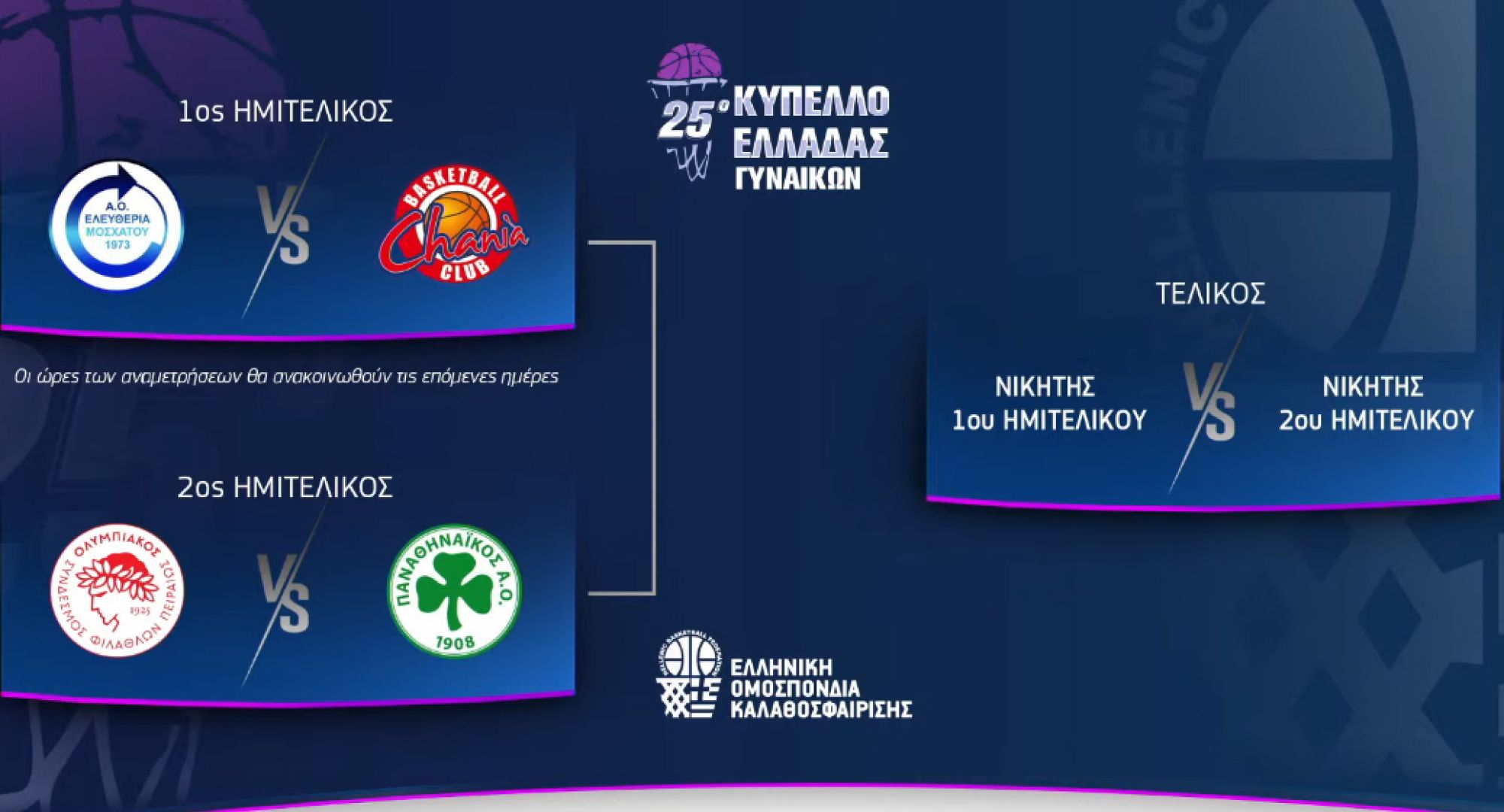 Τον Παναθηναϊκό θα αντιμετωπίσει στον ημιτελικό του Final 4 του Κυπέλλου Μπάσκετ Γυναικών , ο Ολυμπιακός, όπως προέκυψε μετά την κλήρωση που πραγματοποιήθηκε στα γραφεία της ΕΟΚ. Οι «ερυθρόλευκες» μετά τις δυο επικρατήσεις στην κανονική διάρκεια του πρωταθλήματος, θα αντιμετωπίσουν για τρίτη φορά τις «πράσινες» στο Final 4 της διοργάνωσης που θα πραγματοποιηθεί στα Χανιά στις 8-10 Απριλίου. Η ομάδα του Μάρτινς Ζίμπαρτς θα διεκδικήσει την πρόκριση στον τελικό όπου θα βρεθεί και ο νικητής του ζευγαριού του 1ου ημιτελικού, Ελευθερία Μοσχάτου-Χανιά.