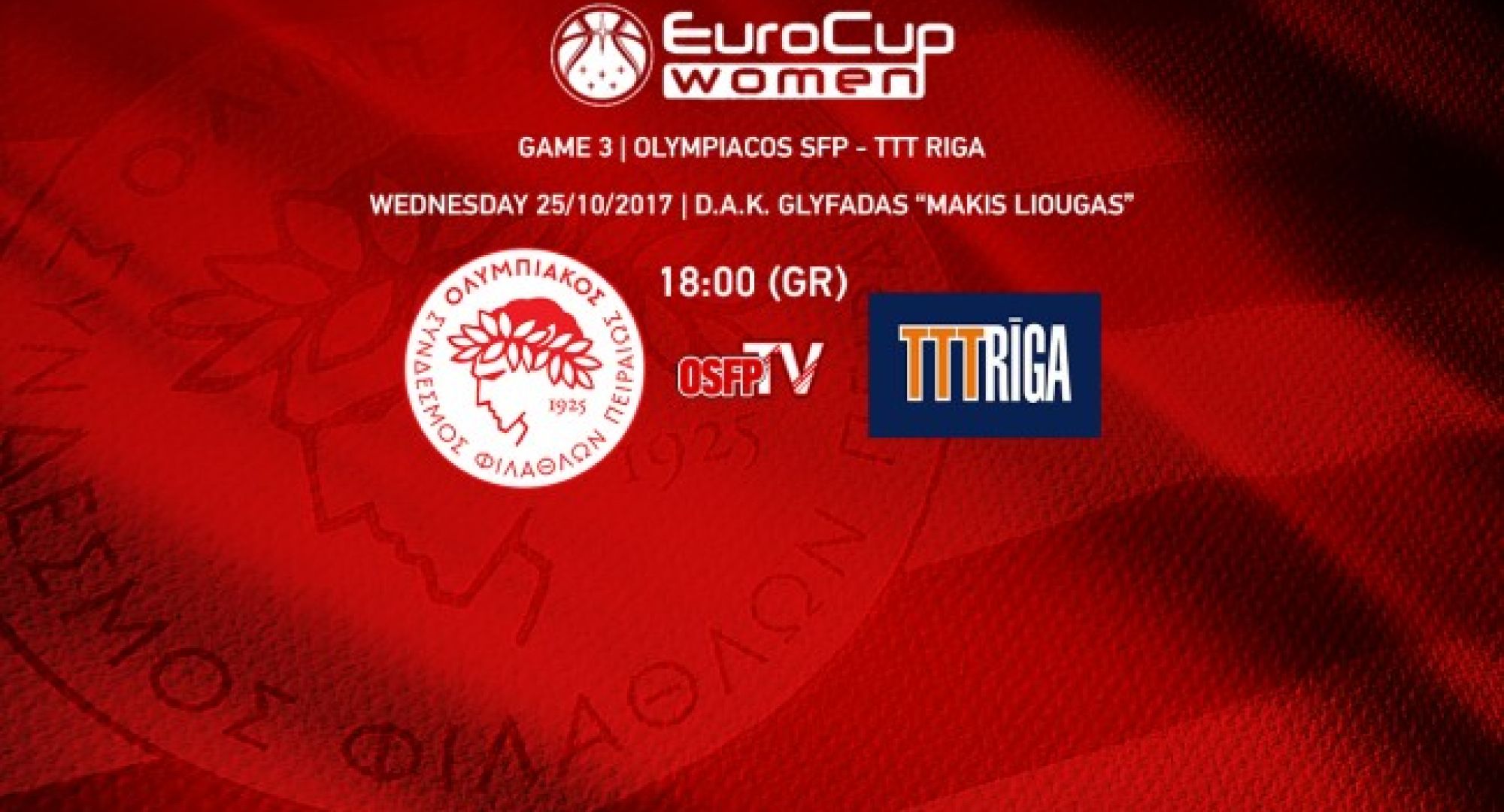 Παρακολουθήστε ζωντανά απο το OSFP TV τον τρίτο αγώνα του Ολυμπιακού για του Euro Cup Women απέναντι στην TTT Riga απο την Λετονία!