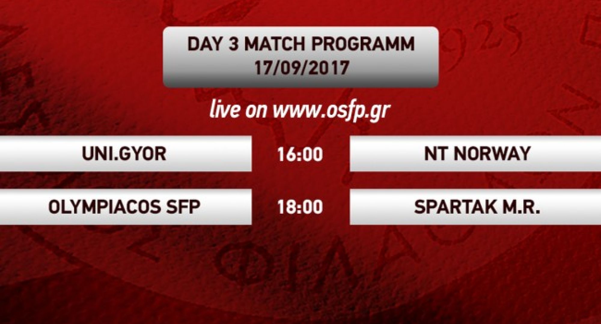 Παρακολουθήστε ζωντανά απο το www.osfp.gr τους αγώνες της τρίτης και τελευταίας ημέρας του 2ου διεθνούς τουρνουά μπάσκετ γυναικών του Ολυμπιακού. Στις 16:00 η UNI.Gyor αντιμετωπίζει την εθνική ομάδα της Νορβηγίας και στις 18:00 στον άτιπο τελικό του τουρνουά ο Ολυμπιακός θα βρεθεί αντιμέτωπος με την Spartak M.R.. Μετά τον τελευταίο αγώνα θα πραγματοποιηθεί η βράβευση των ομάδων.