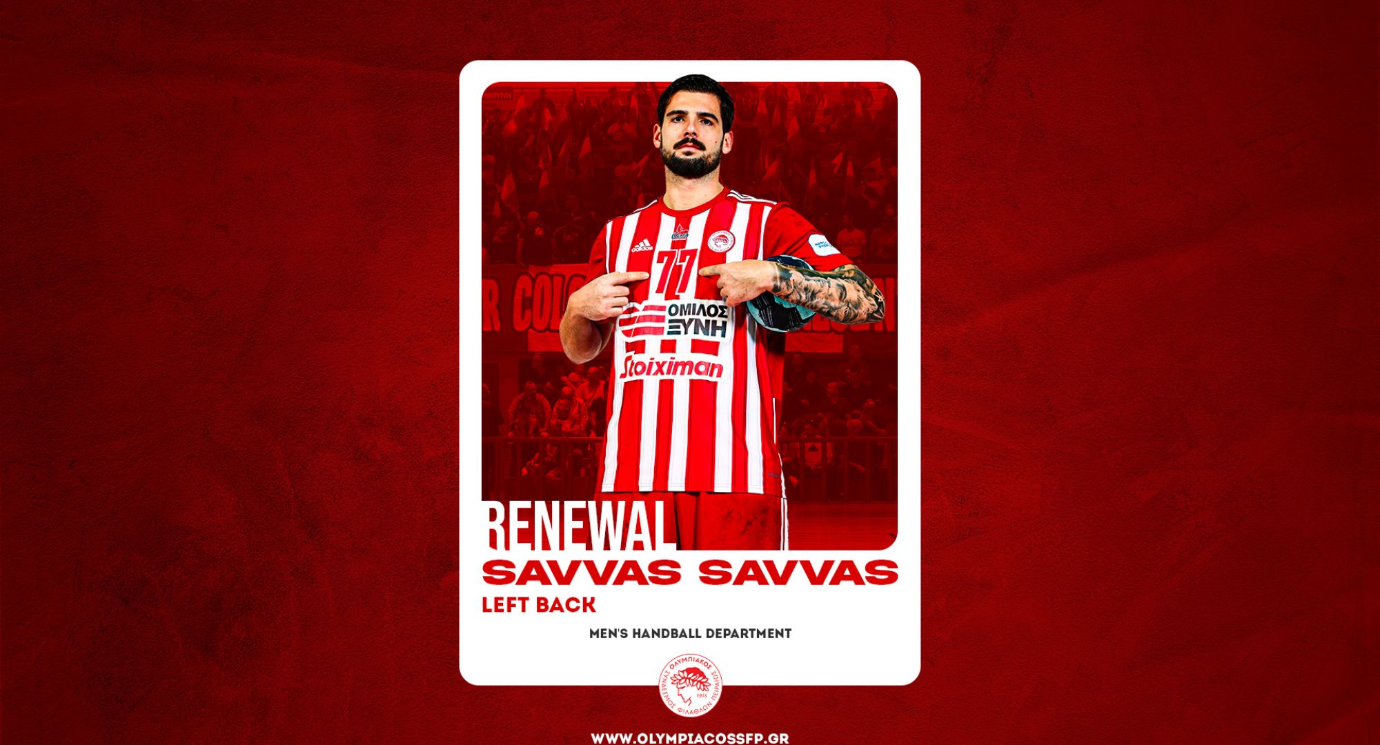 Ο ΟΛΥΜΠΙΑΚΟΣ Σ.Φ.Π. ανακοινώνει την ανανέωση της συνεργασίας του με τον Σάββα Σάββα. Ο διεθνής αριστερός ίντερ υπέγραψε το νέο του συμβόλαιο και παραμένει στο ρόστερ της ομάδας χάντμπολ του συλλόγου.
