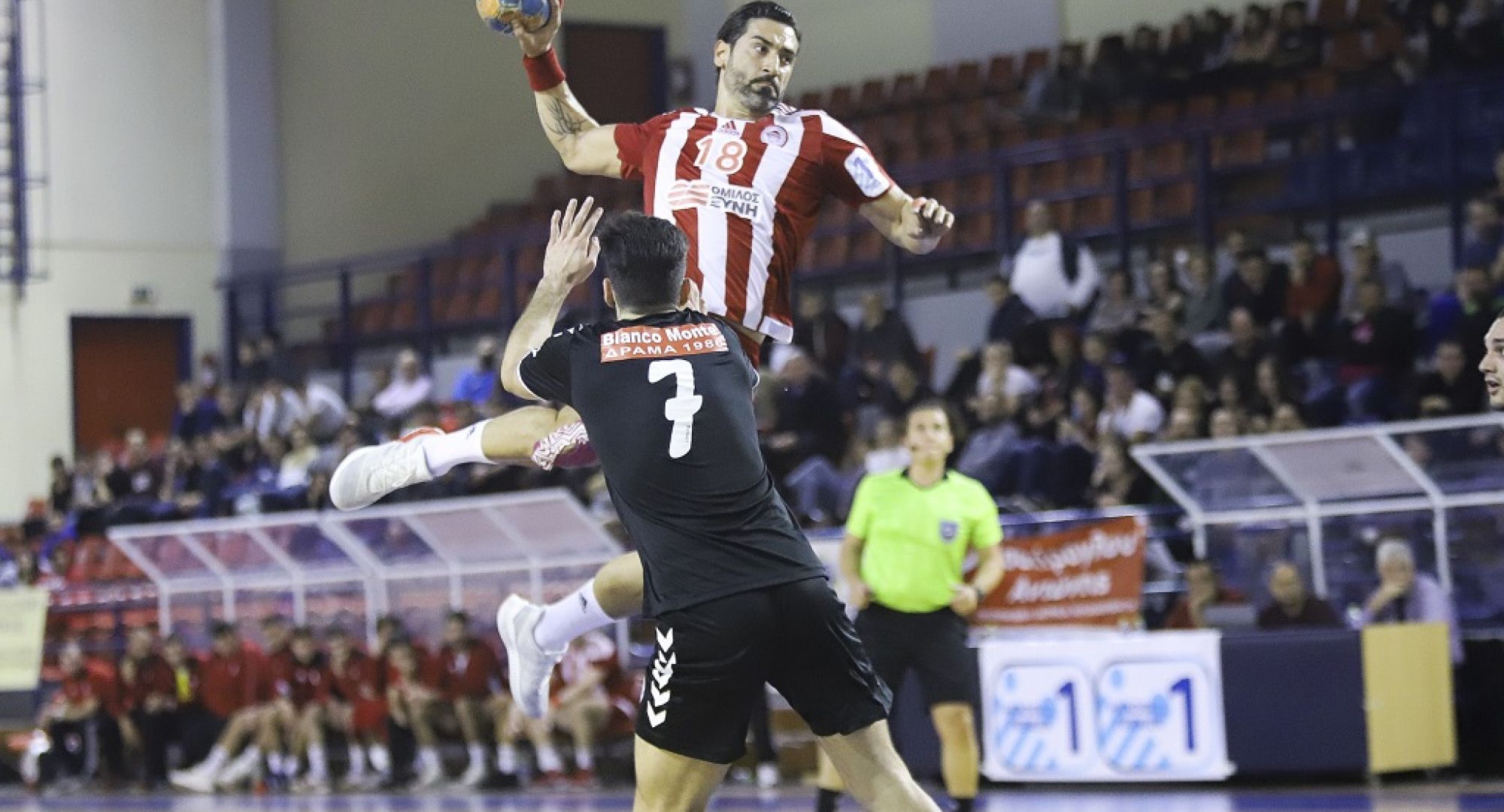 Στο ξεκίνημα της αναμέτρησης καμία από τις δυο ομάδες δεν μπορούσε να πάρει προβάδισμα, με συνεχείς ισοπαλίες να σημειώνονται (2-2 και 4-4). Λίγο πριν τα μέσα του πρώτου ημιχρόνου, ο Ολυμπιακός, με τον Δημήτρη Τζηρά να φτάνει τα τέσσερα τέρματα, προηγήθηκε με 8-5. Οι γηπεδούχοι μείωσαν σε 8-6 αλλά με δυο συνεχόμενα τέρματα από τον Μπούμπαλο, οι «ερυθρόλευκοι» επανέφεραν τη διαφορά στο συν τρία (10-7 στο 18'). Η ολοκλήρωση του πρώτου ημιχρόνου βρήκε τις δυο ομάδες ισόπαλες με 15-15.