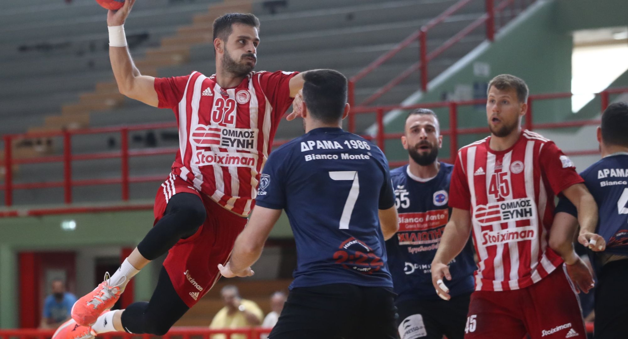 Ο Ολυμπιακός «μπήκε» δυνατά στο ματς και προηγήθηκε με 5-1, με το δεύτερο γκολ του Παπαβασίλη, στο 4:18. Η Δράμα μείωσε σε 7-6, ο Τζηράς «έγραψε» το 8-6, στο 13:22 και το 9-6, στο 15:40, με τον Θρύλο να «πατάει» δυνατά το «γκάζι» και να ξεφεύγει με +5 (16-11), με τον Δομπρή, στο 25:28. Ο Δομπρής «χτύπησε» ξανά, με εύστοχη εκτέλεση πέναλτι (28:32), για το +6 (18-12), ενώ το πρώτο ημίχρονο ολοκληρώθηκε με 18-13 προβάδισμα. Οι «ερυθρόλευκοι» ξεκίνησαν πολύ δυνατά το δεύτερο μέρος και έφτασαν στο +12 (34-22), με γκολ του Τζηρά, στο 50ό λεπτό, με τον Δομπρή να δίνει «αέρα» +13 (35-22), στο 50:49. Στο 52:05, ο Μοντόρο έκανε το +14 (36-22), με τον Ολυμπιακό να κυριαρχεί απόλυτα. Το τελικό 41-29 διαμόρφωσε ο Μοντόρο, στο 59:42.