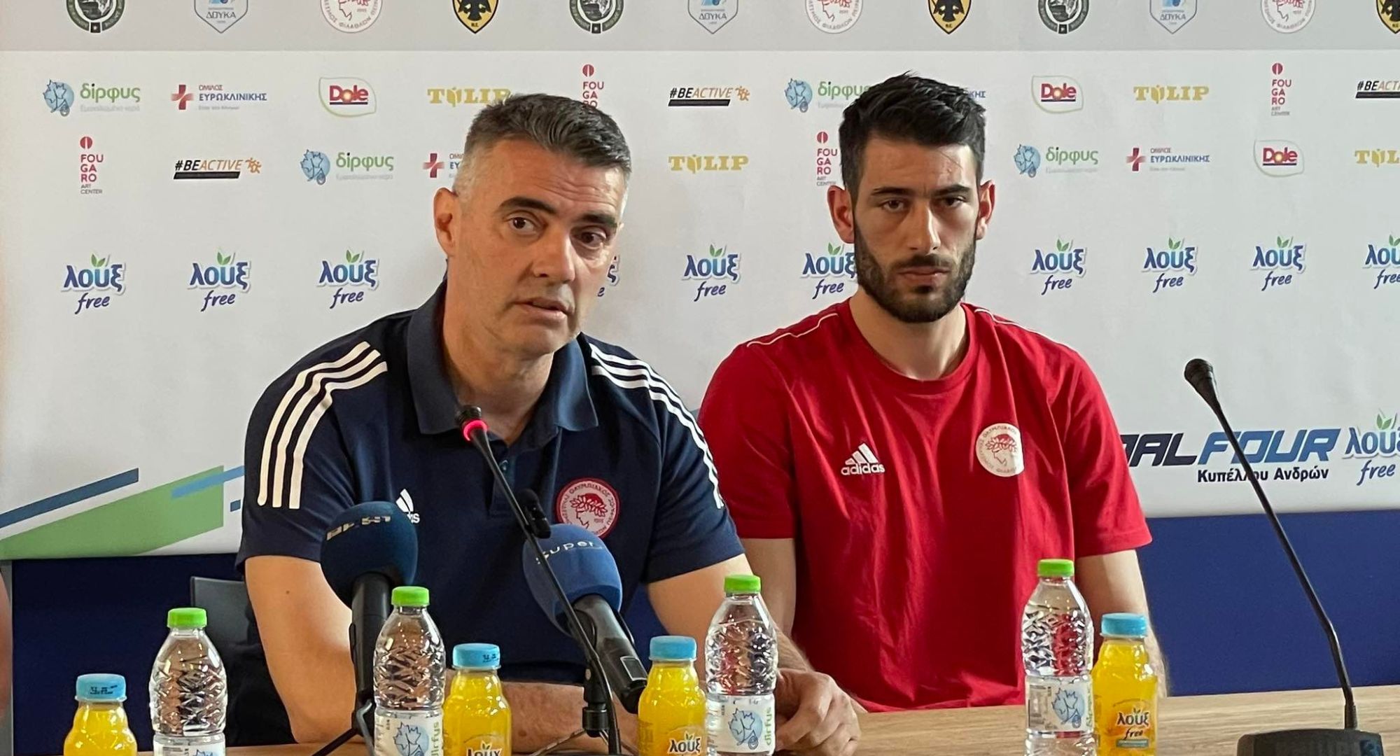 Η τοποθέτηση του αρχηγού του Ολυμπιακού, Πέτρου Κανδύλα: «Καταρχάς, θα ήθελα να ευχαριστήσω τους δυο προπονητές για τα καλά τους λόγια. Για εμάς τους αθλητές της εθνικής μας ομάδας, ήταν τεράστια χαρά να πάρουμε αυτή την πρόκριση μετά από τόσα χρόνια προσπαθειών. Θεωρώ ότι αυτή η πρόκριση είναι η αρχή για να ανεβάσουμε το άθλημα ακόμα πιο ψηλά. Για τους δυο ημιτελικούς τώρα, θεωρώ ότι η κλήρωση έτυχε έτσι ώστε να βγάλει δυο ισοδύναμα παιχνίδια. Η αντίπαλος μας η ΑΕΚ είναι μια πάρα πολύ καλή ομάδα, έχει ενισχυθεί φέτος σε καίριες θέσεις , η άμυνα της σε αντίθεση με πέρσι είναι πάρα πολύ δυνατή. Όσο αφορά εμάς τώρα, όλη την προηγούμενη περίοδο προετοιμαστήκαμε κατάλληλα, έχουμε προσθέσει 2-3 καινούρια πράγματα στο παιχνίδι μας τα οποία σε αυτού του είδους τους αγώνες μπορεί να δώσουν και την νίκη. Κλείνοντας θέλω κι εγώ να ευχαριστήσω τον Δήμο Ναυπλίου, τους τοπικούς φορείς και να ευχηθώ ένα καλό Final-4, ας νικήσει ο καλύτερος».