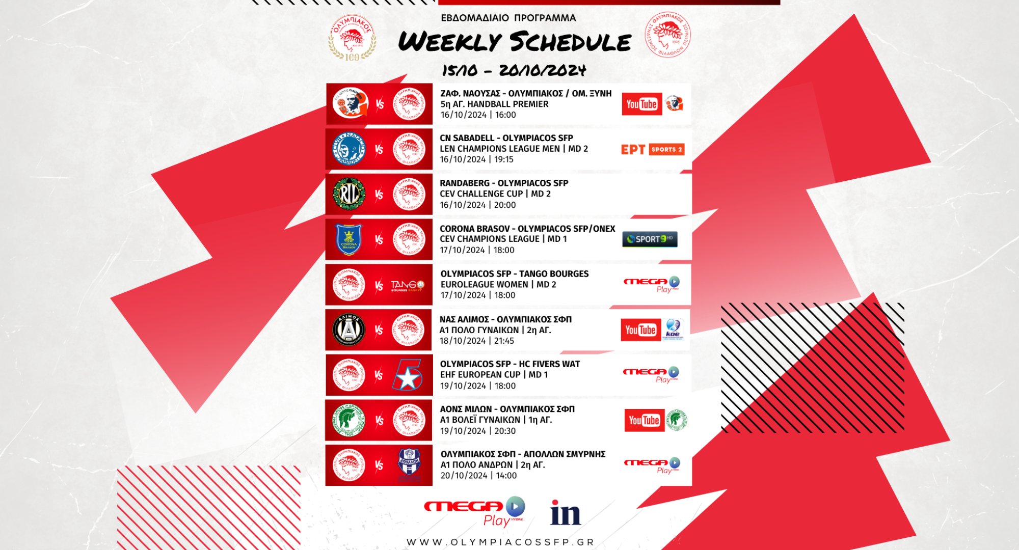 Γεμάτη αγωνιστική δράση είναι και αυτή η βδομάδα, για τις ομάδες του Ολυμπιακού. Εννιά «μάχες» για τα ομαδικά τμήματα του Θρύλου, σε Ελλάδα και Ευρώπη, οκτώ εκ των οποίων με ζωντανή τηλεοπτική ή διαδικτυακή μετάδοση!