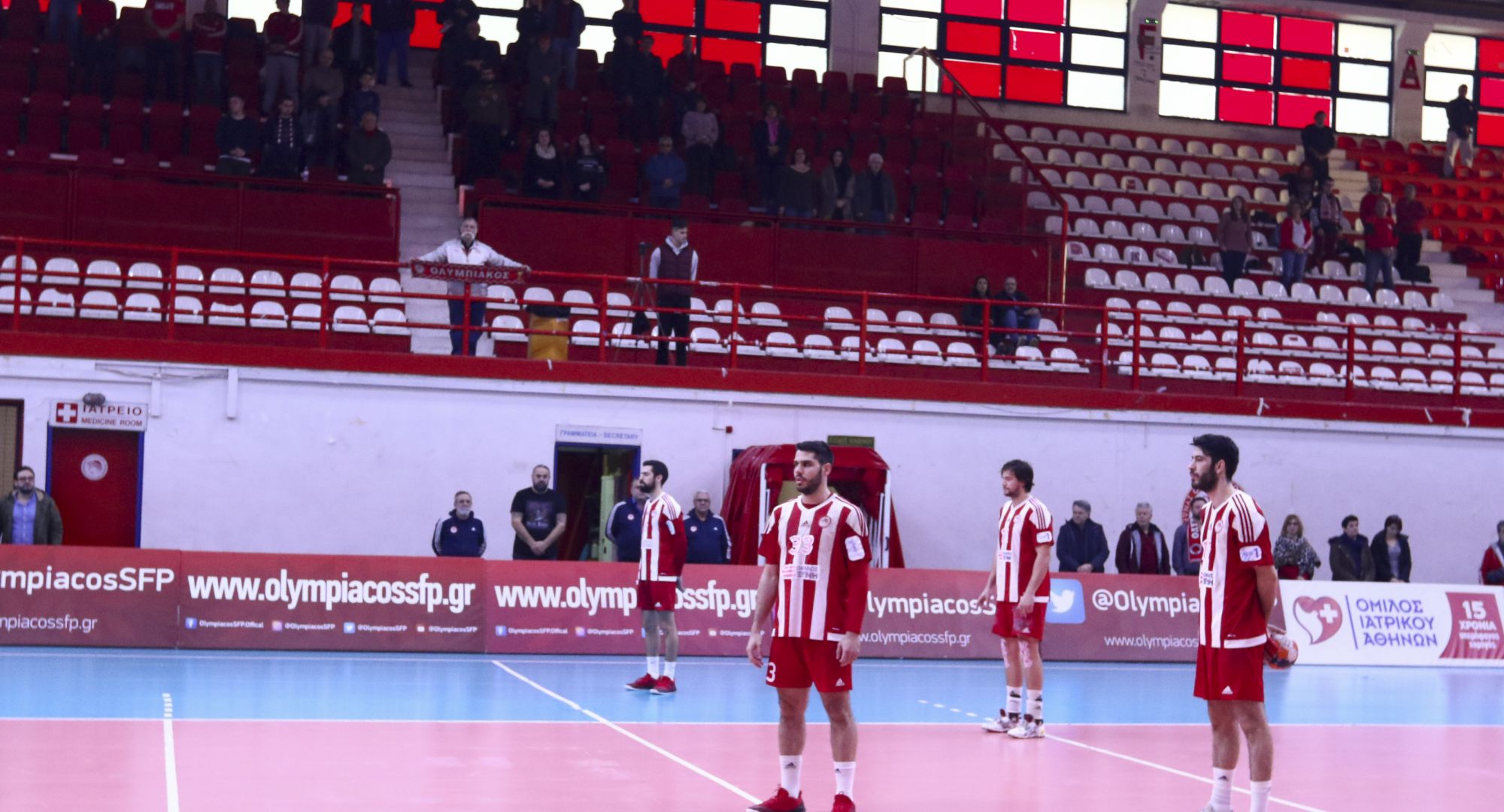 Τη 15η νίκη του στη Handball Premier πανηγύρισε ο Ολυμπιακός Σ.Φ.Π.- «Όμιλος Ξυνή» που επικράτησε άνετα με 26 γκολ διαφορά και σκορ 38-12, της Δράμας στο Κλειστό Γυμναστήριο Ρέντη «Μ. Μερκούρη» στο πλαίσιο της 16ης αγωνιστικής. Οι Πειραιώτες, διεύρυναν το αήττητο στις εγχώριες διοργανώσεις προσθέτοντας μια ακόμα καλή εμφάνιση στο ενεργητικό τους με όπλο την εξαιρετική άμυνα. Στην αναμέτρηση με την ομάδα της Δράμας δεν αγωνίστηκε ο Γρηγόρης Σανίκης λόγω ίωσης ενώ το ντεμπούτο του με την «ερυθρόλευκη» φανέλα πραγματοποίησε ο νεοαποκτηθείς Τζούρο Μούγιτς. Πριν την έναρξη του αγώνα κρατήθηκε ενός λεπτού σιγή στη μνήμη των 21 θυμάτων της Θύρας 7.