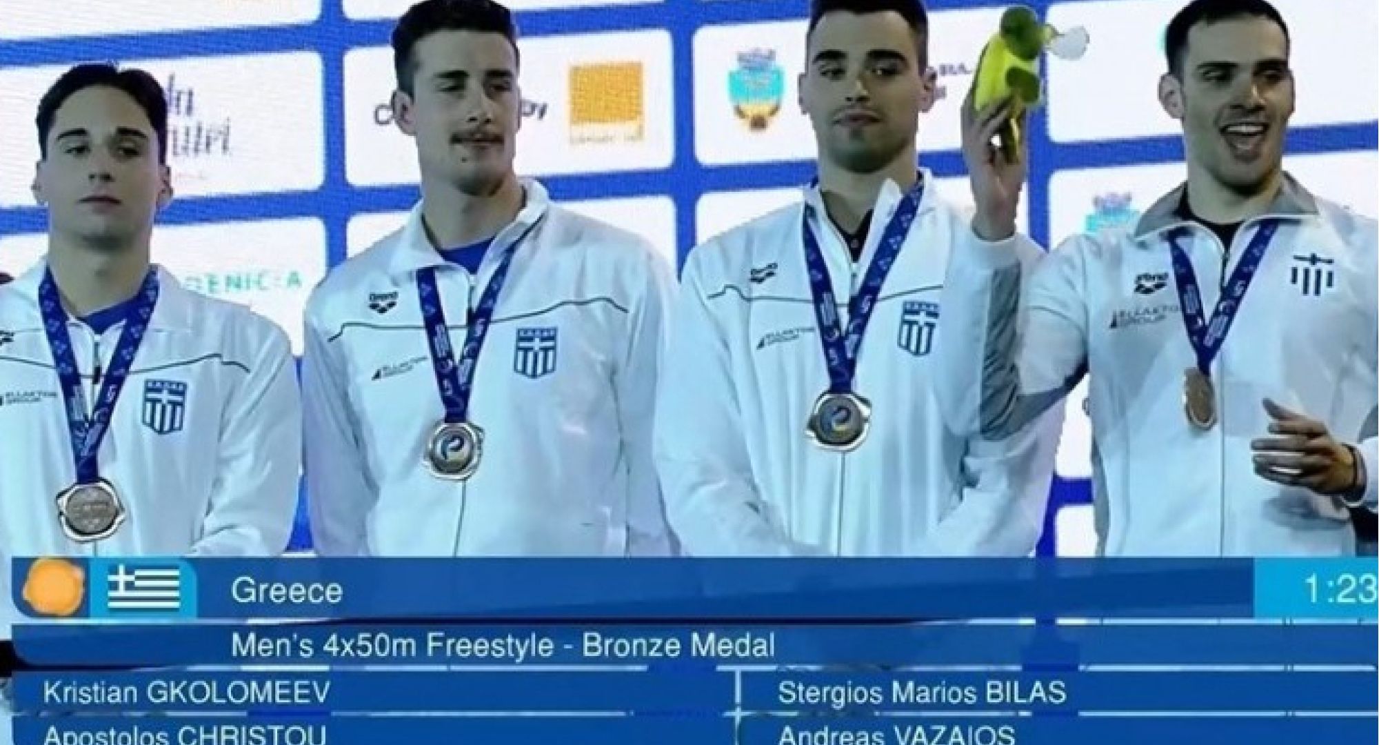 Το χάλκινο μετάλλιο στα 4Χ50μ. ελεύθερο, στο Ευρωπαϊκό πρωτάθλημα 25άρας πισίνας στο Οτοπένι, κατέκτησαν οι πρωταθλητές του τμήματος κολύμβησης του Ολυμπιακού, Απόστολος Χρήστου και Στέργιος-Μάριος Μπίλας, μαζί με τους Κριστιάν Γκολομέεβ και Ανδρέα Βαζαίο, γράφοντας ιστορία! Στον τελικό του αγωνίσματος στη Ρουμανία, οι κολυμβητές του Θρύλου και οι Γκολομέεβ, Βαζαίος πραγματοποίησαν εξαιρετική επίδοση και με Πανελλήνιο ρεκόρ 1:23.27, ανέβηκαν στο τρίτο σκαλί του βάθρου, χαρίζοντας στην Ελλάδα και την Εθνική μας ομάδα το 19ο μετάλλιο στη διοργάνωση, αλλά και το πρώτο ομαδικό!