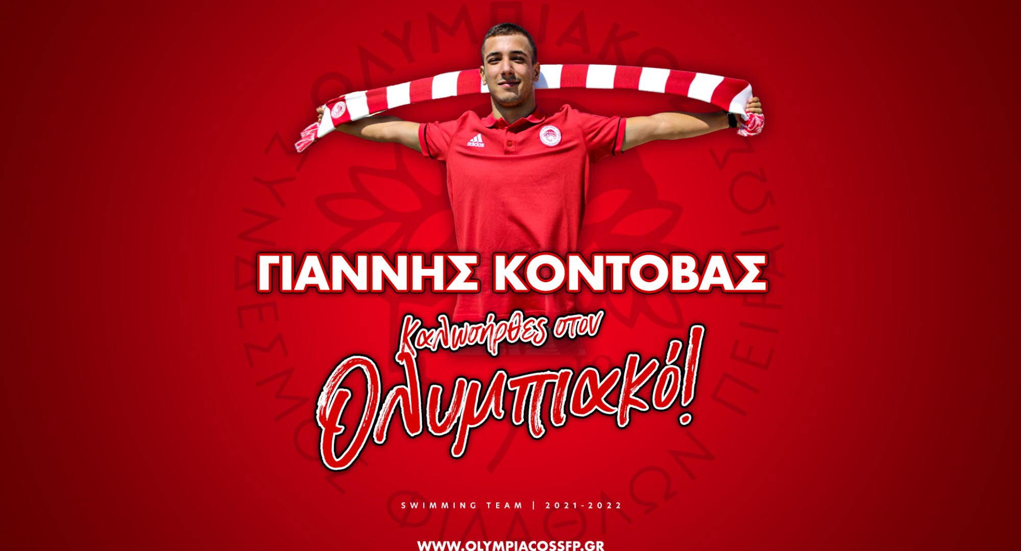 Ο ΟΛΥΜΠΙΑΚΟΣ Σ.Φ.Π. ανακοινώνει την έναρξη της συνεργασίας του με τον Γιάννη Κοντοβά. Ο νεαρός αθλητής (ημ. γέννησης 29/5/2003) εντάσσεται στο δυναμικό του αγωνιστικού τμήματος Κολύμβησης του Συλλόγου μας.