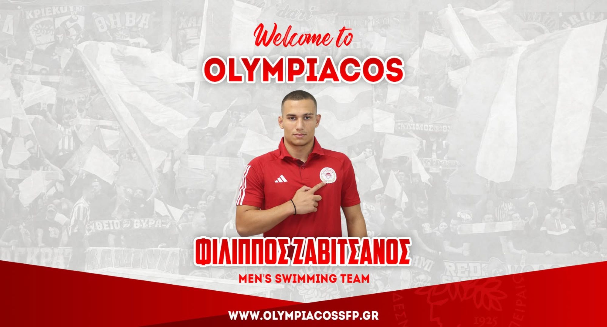 Ο ΟΛΥΜΠΙΑΚΟΣ Σ.Φ.Π. ανακοινώνει την έναρξη της συνεργασίας του με τον Φίλιππο Ζαβιτσάνο. Ο 16χρονος αθλητής (ημ. γέννησης 23/4/2009, 1,80μ.) εντάσσεται στην ομάδα κολύμβησης του συλλόγου.