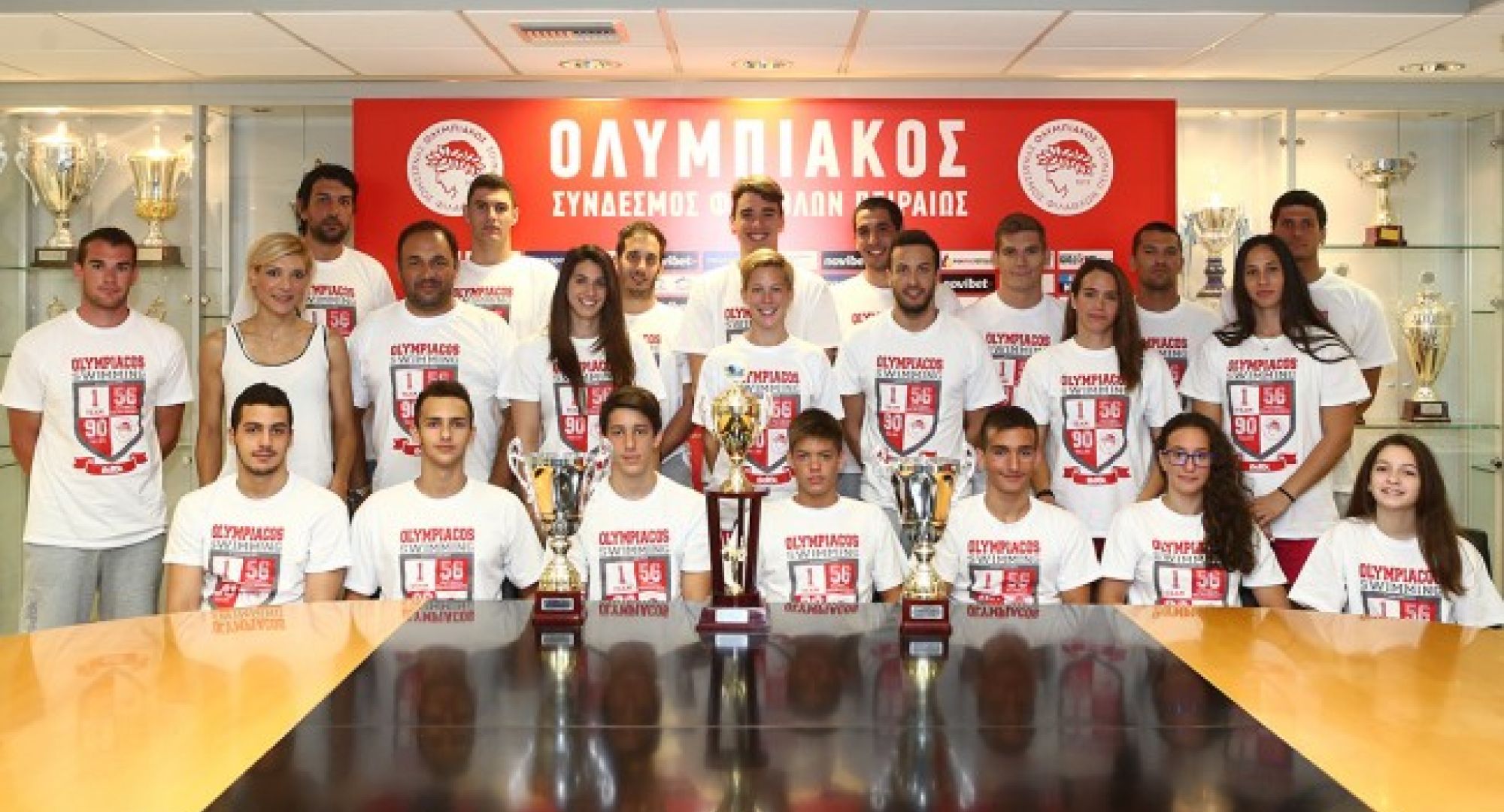 Οι «ερυθρόλευκοι» πρωταθλητές του Νίκου Γέμελου, φωτογραφήθηκαν με τις τρεις κούπες που κατέκτησε ο σύλλογος μας σε Άνδρες, Γυναίκες και σύνολο. Η Γενική Διευθύντρια και Ειδική Γραμματέας του Ολυμπιακού, Χριστίνα Τσιλιγκίρη μετέφερε εκ μέρους της διοίκησης τα θερμά συγχαρητήρια στους αθλητές για αυτή την επιτυχία και τους ευχήθηκε καλή συνέχεια στις επόμενες αγωνιστικές υποχρεώσεις που έρχονται. Από την πλευρά του ο αρχιπροπονητής Νίκος Γέμελος ευχαρίστησε τη διοίκηση για τη στήριξη που παρέχεται στο τμήμα Κολύμβησης.