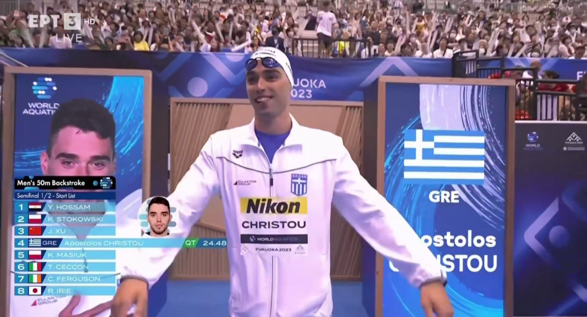 Ο πρωταθλητής του Ολυμπιακού, Απόστολος Χρήστου, συμμετείχε στην πρώτη ημιτελική σειρά των 50 μέτρων ύπτιο και τερμάτισε 3ος με χρόνο 24.57, όσο και ο Ιταλός πρωταθλητής Τσεκόν.