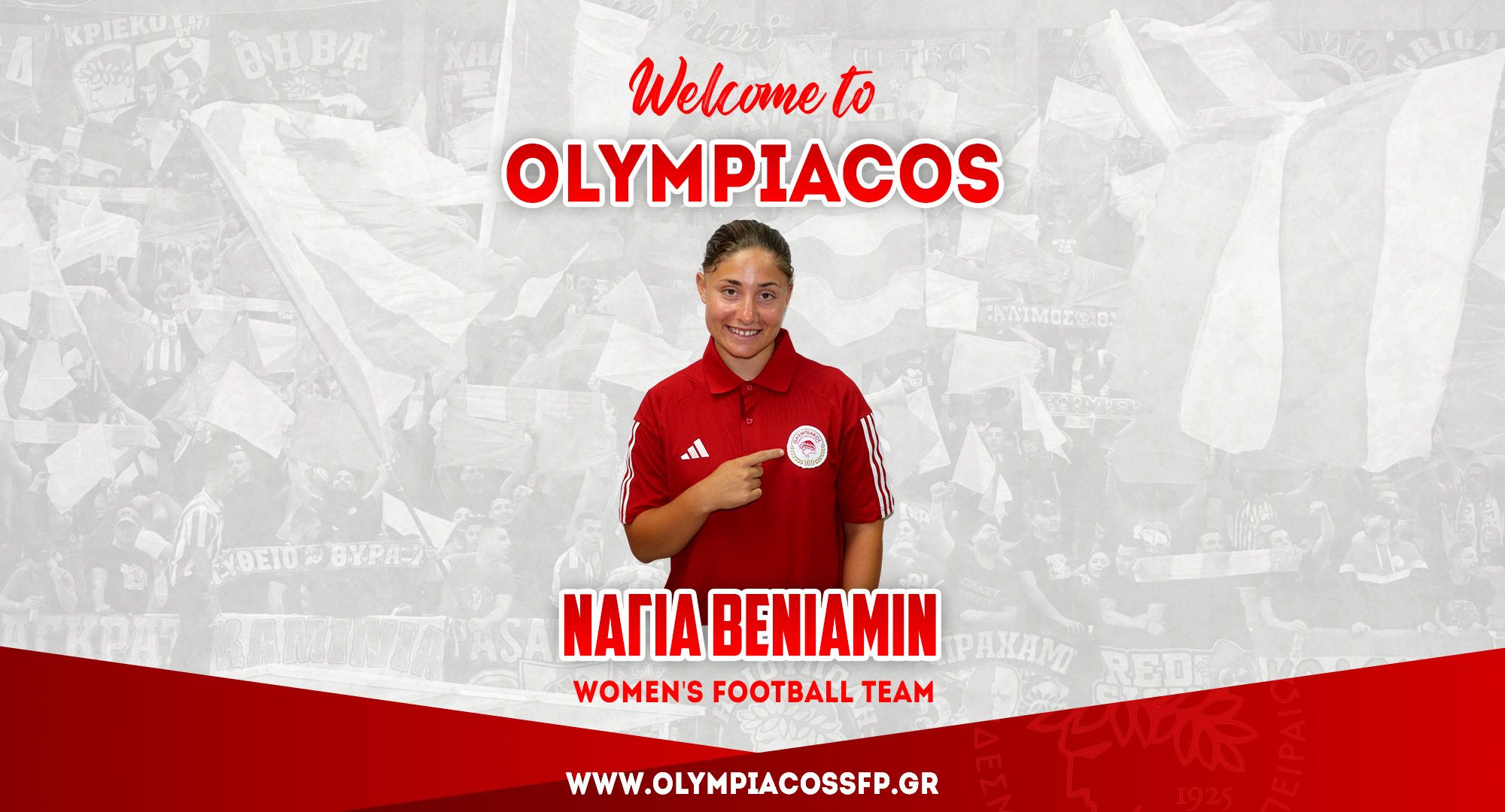 Ο ΟΛΥΜΠΙΑΚΟΣ Σ.Φ.Π. ανακοινώνει την έναρξη της συνεργασίας του με τη Νάγια Βενιαμίν. Η 20χρονη (ημ. γέννησης 21/07/2005) επιθετικός, διεθνής με την Εθνική Νεανίδων και Κορασίδων, υπέγραψε το συμβόλαιό της και εντάσσεται στο ρόστερ της ομάδας ποδοσφαίρου Γυναικών του συλλόγου.