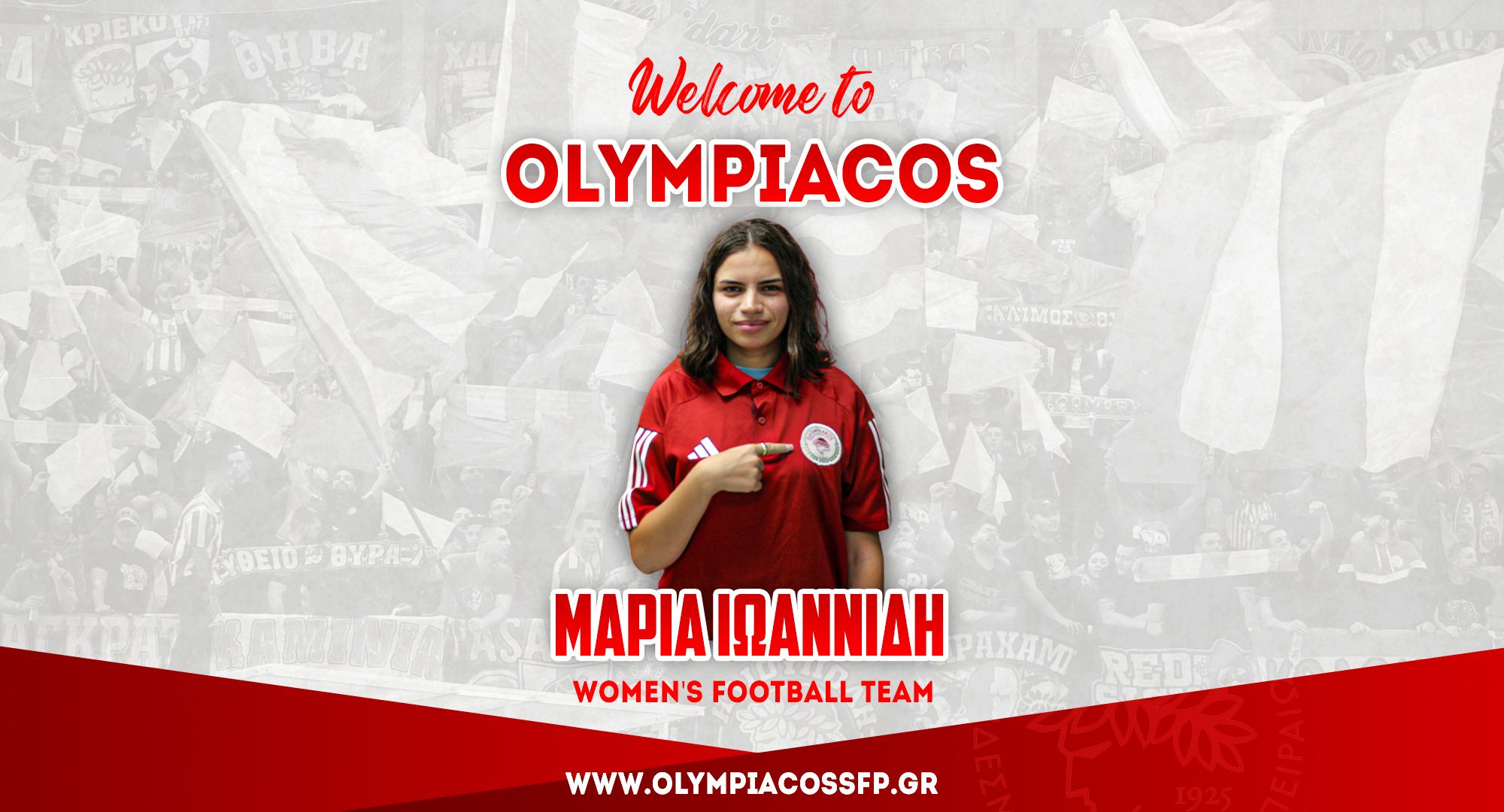 Ο Ολυμπιακός Σ.Φ.Π. ανακοινώνει την έναρξη της συνεργασίας του με τη Μαρία Ιωαννίδη. Η 21χρονη (ημ. γέννησης 21/10/2004) αθλήτρια, η οποία αγωνίζεται ως αμυντικό χαφ, υπέγραψε το συμβόλαιό της και εντάσσεται στο ρόστερ της ομάδας ποδοσφαίρου Γυναικών.