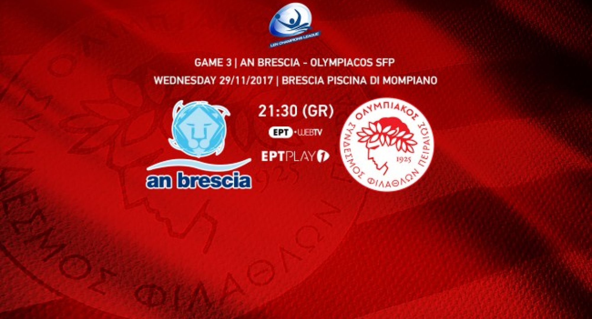 Παρακολουθήστε ζωντανά τον αγώνα Μπρέσια - Ολυμπιακός για την 3η αγωνιστική του LEN Champions League απο το κανάλι της ERT web TV, ERT Play 1!