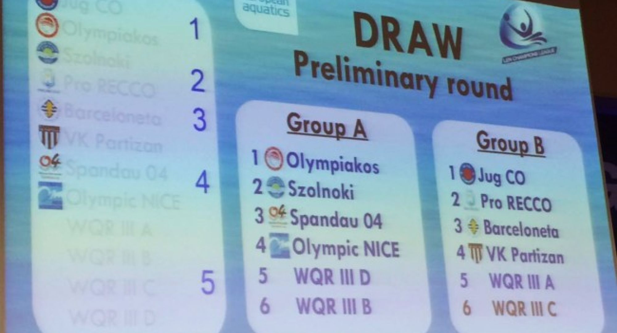 Πραγματοποιήθηκε σήμερα στο Ντουμπρόβνικ της Κροατίας, η κλήρωση των ομίλων του Champions League της σεζόν 2016-2017 για την Υδατοσφαίριση Ανδρών. Ο Ολυμπιακός τέθηκε επικεφαλής στον Α’ όμιλο και κληρώθηκε με την διοργανώτρια του Final Six, Ζόλνοκ (Ουγγαρία), τη Σπαντάου (Γερμανία), την Νις (Γαλλία) και δυο ακόμα ομάδες που θα προκύψουν από τους δυο προκριματικούς γύρους οι οποίοι θα ολοκληρωθούν μεταξύ 14 και 16 Οκτωβρίου. Η έναρξη του Champions League είναι προγραμματισμένη για τις 30 Νοεμβρίου με την διεξαγωγή της 1ης αγωνιστικής ενώ το Final Six θα διεξαχθεί στις 25 με 27 Μαΐου στη Βουδαπέστη. Στην διαδικασία της κλήρωσης του Champions League, τον Ολυμπιακό εκπροσώπησε η Γενική Αργηχός του συλλόγου, Χριστίνα Τσιλιγκίρη. Πριν από την κλήρωση είχε διεξαχθεί το ετήσιο γκαλά σχετικά με το LEN Champions League του πόλο, για την νέα περίοδο. Τα θέματα της συζήτησης ήταν η διοργάνωση, η ανάπτυξη του brand, το επόμενο final six, οι wild cards, τα τηλεοπτικά, η προβολή των χορηγών και η διαφήμιση.