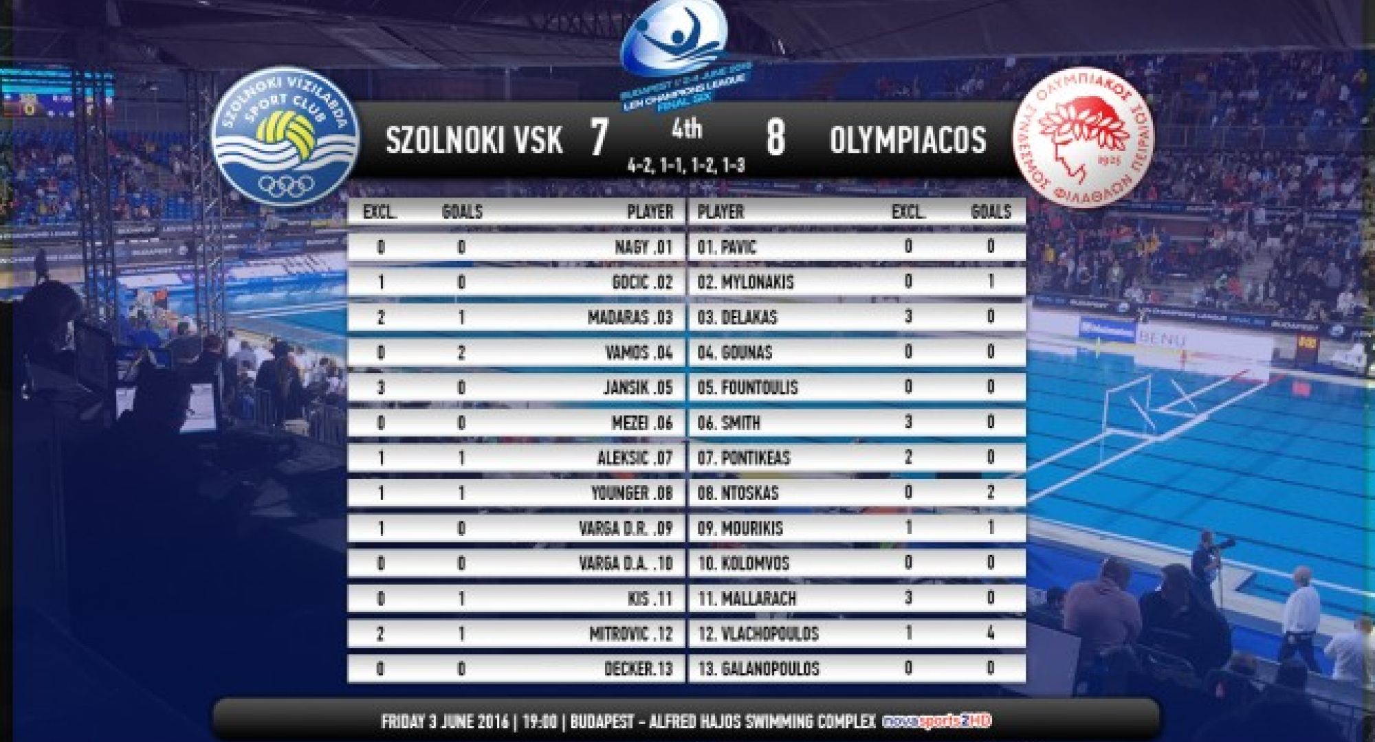 Szolnok found themselves 4-2 to the good after the first quarter, but despite twice taking the lead they had twice been pegged back by their Greek opponents who had been level at 2-2 in the last minute of the quarter. Stefan Mitrović had given Szolnok a lead, only for Giorgos Ntoskas to level. Aaron Younger put Szolnok ahead for a second time but again Olympiacos came back, this time through Angelos Vlachopoulos. Szolnok forged ahead late in the quarter though, Norbert Madaras putting them ahead for a third time with 31 seconds to go before Milan Aleksić added a spectacular fourth right on the whistle.