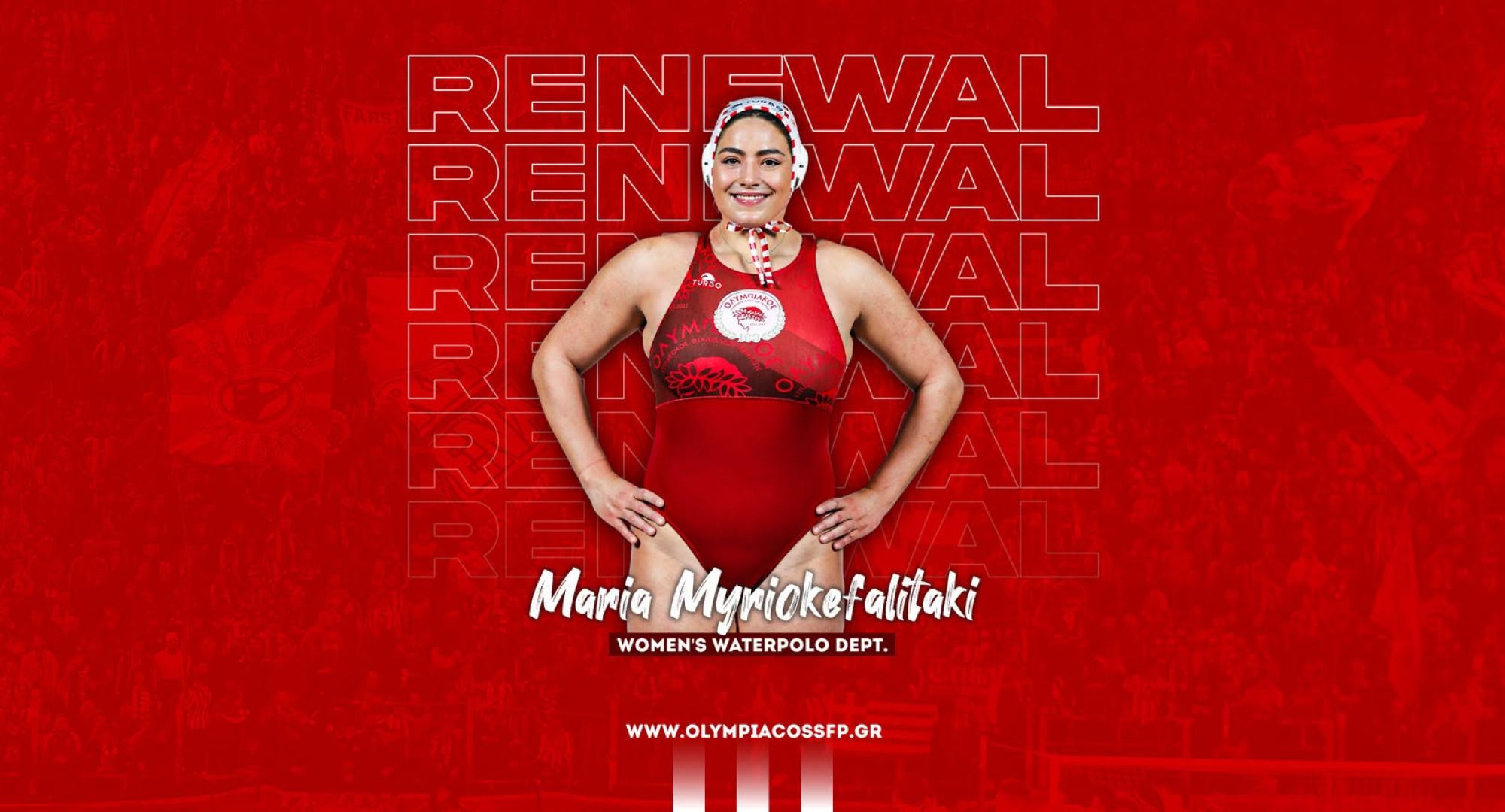 Ο ΟΛΥΜΠΙΑΚΟΣ Σ.Φ.Π. ανακοινώνει την ανανέωση της συνεργασίας του με την Μαρία Μυριοκεφαλιτάκη. Η διεθνής φουνταριστή υπέγραψε το νέο της συμβόλαιο και παραμένει στο ρόστερ της ομάδας πόλο Γυναικών του συλλόγου.