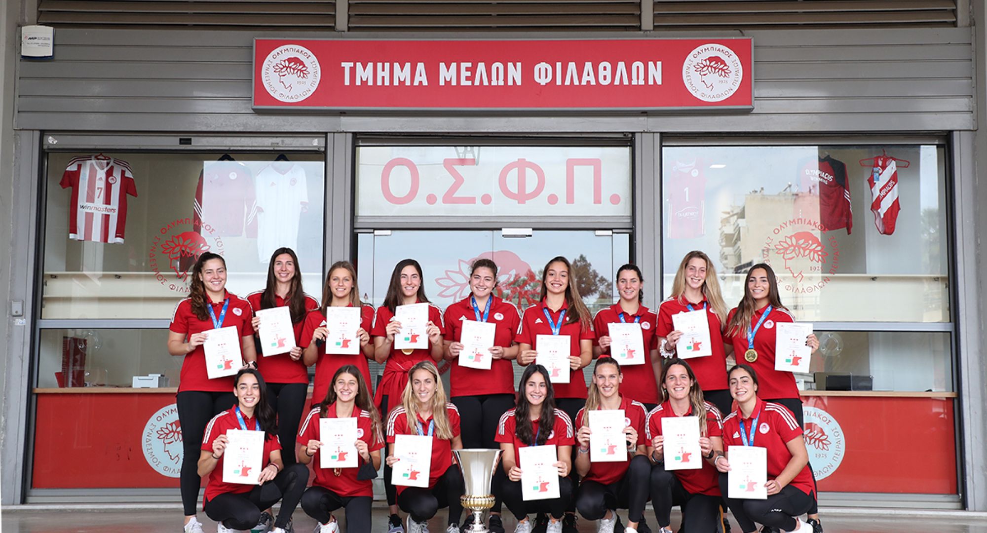 Τα ηλεκτρονικά εισιτήρια για την «εικονική» κερκίδα της φιέστας του 46ου Πρωταθλήματος της ομάδας ποδοσφαίρου που θα πραγματοποιηθεί μετά την αναμέτρηση με τον ΠΑΟΚ, την Τετάρτη 12 Μαΐου, προμηθεύτηκαν σήμερα οι Πρωταθλήτριες Ευρώπης! Η κορυφαία ομάδα του Ευρωπαϊκού γυναικείου πόλο, για τη σεζόν 2020-2021, επισκέφθηκε το απόγευμα της Τετάρτης (5/5) το Τμήμα Μελών και Φιλάθλων στο «Γ. Καραϊσκάκης» προκειμένου να «πάρει θέση στην κερκίδα». Τα χρυσά κορίτσια του Ολυμπιακού, πήραν τα ηλεκτρονικά εισιτήρια και έστειλαν το δικό τους μήνυμα στον κόσμο του Θρύλου, για ένα «εικονικά» γεμάτο «Γ. Καραϊσκάκης» το βράδυ της 12ης Μαΐου.