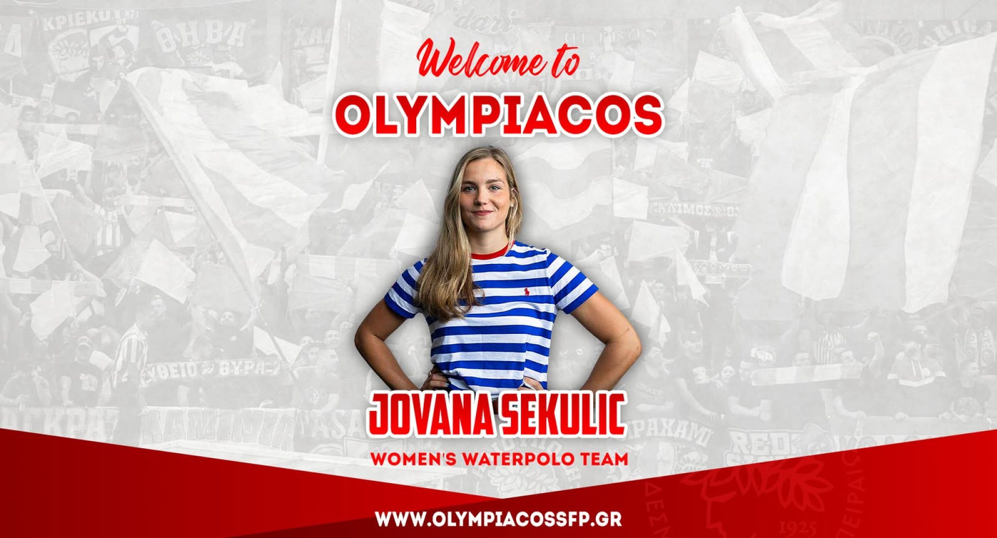 Ο ΟΛΥΜΠΙΑΚΟΣ Σ.Φ.Π. ανακοινώνει την έναρξη της συνεργασίας του με τη Γιοβάνα Σέκουλιτς. Η διεθνής αθλήτρια με την Εθνική ομάδα των ΗΠΑ, γεννημένη στη Σερβία (ημ. γέννησης 7/11/2002), υπέγραψε το νέο της συμβόλαιο και εντάσσεται στο ρόστερ της ομάδας πόλο Γυναικών του συλλόγου.