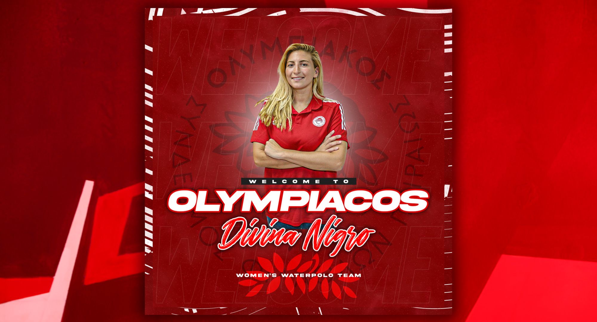 O ΟΛΥΜΠΙΑΚΟΣ Σ.Φ.Π. ανακοινώνει την έναρξη της συνεργασίας του με την Ντιβίνα Νίγκρο. Η Ελληνοϊταλίδα τερματοφύλακας (ημ. γέννησης 13/11/1997, 1,77μ.) υπέγραψε το νέο της συμβόλαιο και εντάσσεται στο ρόστερ της ομάδας πόλο Γυναικών του συλλόγου.