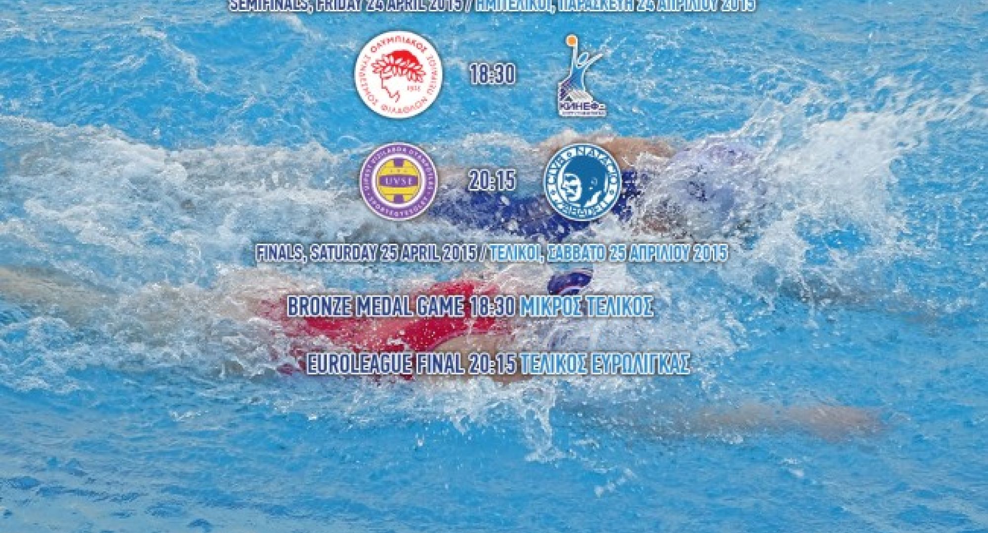 Το πρόγραμμα των αγώνων του «Εθνική Ασφαλιστική Euro League Final Four» στο πόλο γυναικών που θα διεξαχθεί την Παρασκευή 24 και το Σάββατο 25 Απριλίου στο Εθνικό Κολυμβητήριο του Πειραιά «Π. Καπαγέρωφ» είναι το εξής: