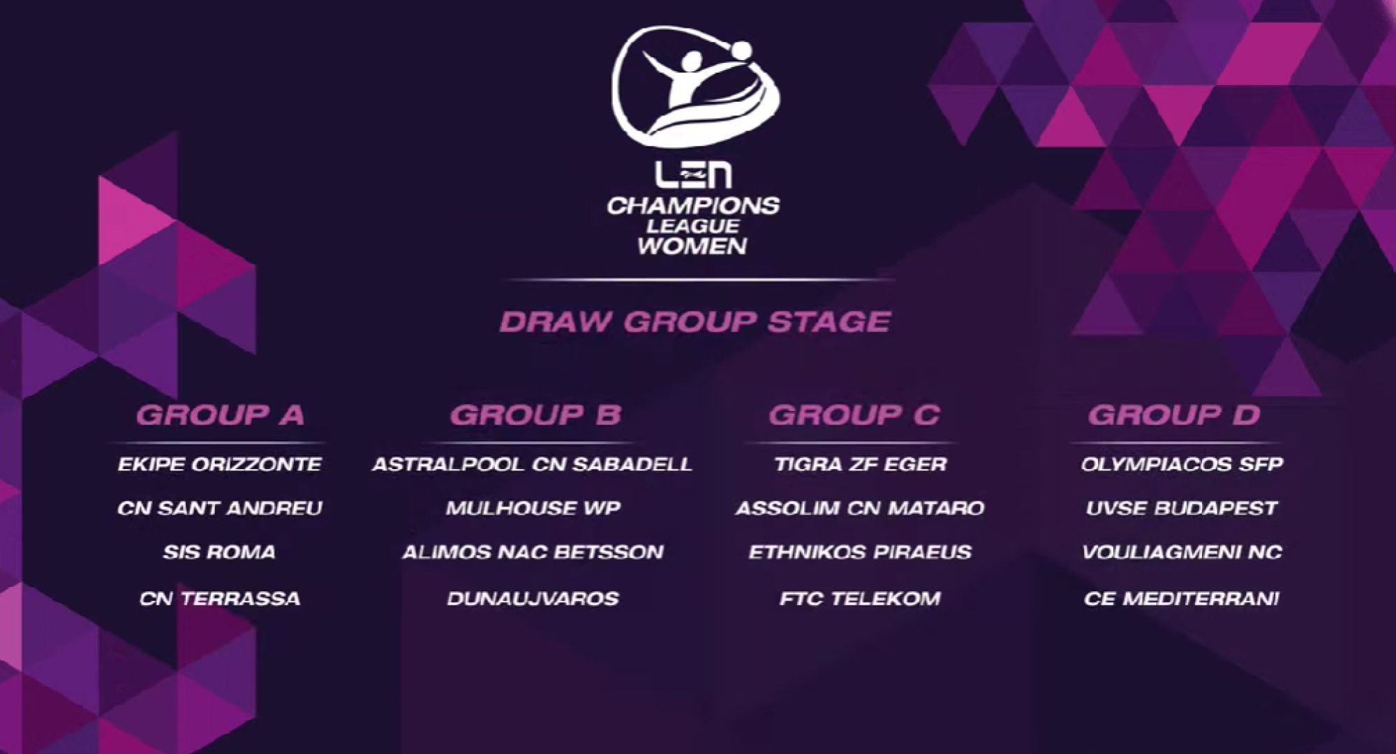 Πραγματοποιήθηκε, την Τρίτη (26/9) το μεσημέρι, στην Ισπανία η κλήρωση της φάσης των ομίλων του Champions League. Η ομάδα πόλο Γυναικών του Ολυμπιακού κληρώθηκε στον Δ' όμιλο της κορυφαίας ευρωπαϊκής διασυλλογικής διοργάνωσης με αντιπάλους την Ουίπεστ από την Ουγγαρία, τον ΝΟ Βουλιαγμένης και την Μεντιτεράνι από την Ισπανία.
