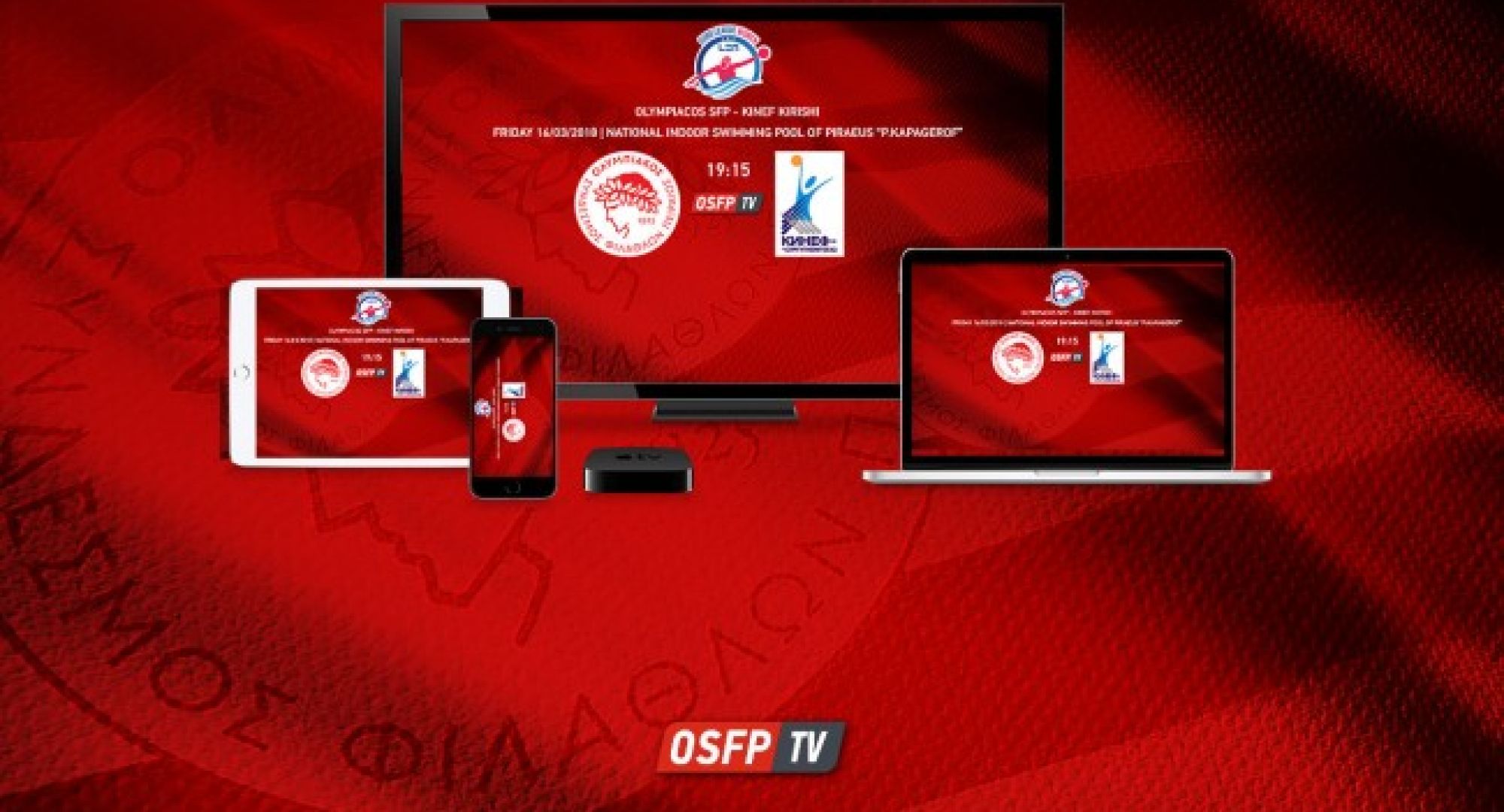 Ο Ολυμπιακός θέλοντας να δώσει την ευκαιρία σε όλο και περισσότερους φίλους του, σε ολόκληρο τον κόσμο, να παρακολουθήσουν τον πολύ σημαντικό προημιτελικό αγώνα του τμήματος πόλο γυναικών, απέναντι στην Πρωταθλήτρια Ευρώπης Κίνεφ Κίρισι, θα προχωρήσει σε τηλεοπτική μετάδοση του συγκεκριμένου αγώνα μέσω του OSFPtv. Με αυτό τον τρόπο, τα μέλη, οι φίλαθλοι και όλοι οι φίλοι του Ολυμπιακού, θα έχουν την ευκαιρία να παρακολουθήσουν ζωντανά την αναμέτρηση αυτή, μέσω του υπολογιστή τους, του smartphone ή tablet τους ή ακόμα και απο την smart TV τους, σε οποιοδήποτε σημείο του πλανήτη και αν βρίσκονται!