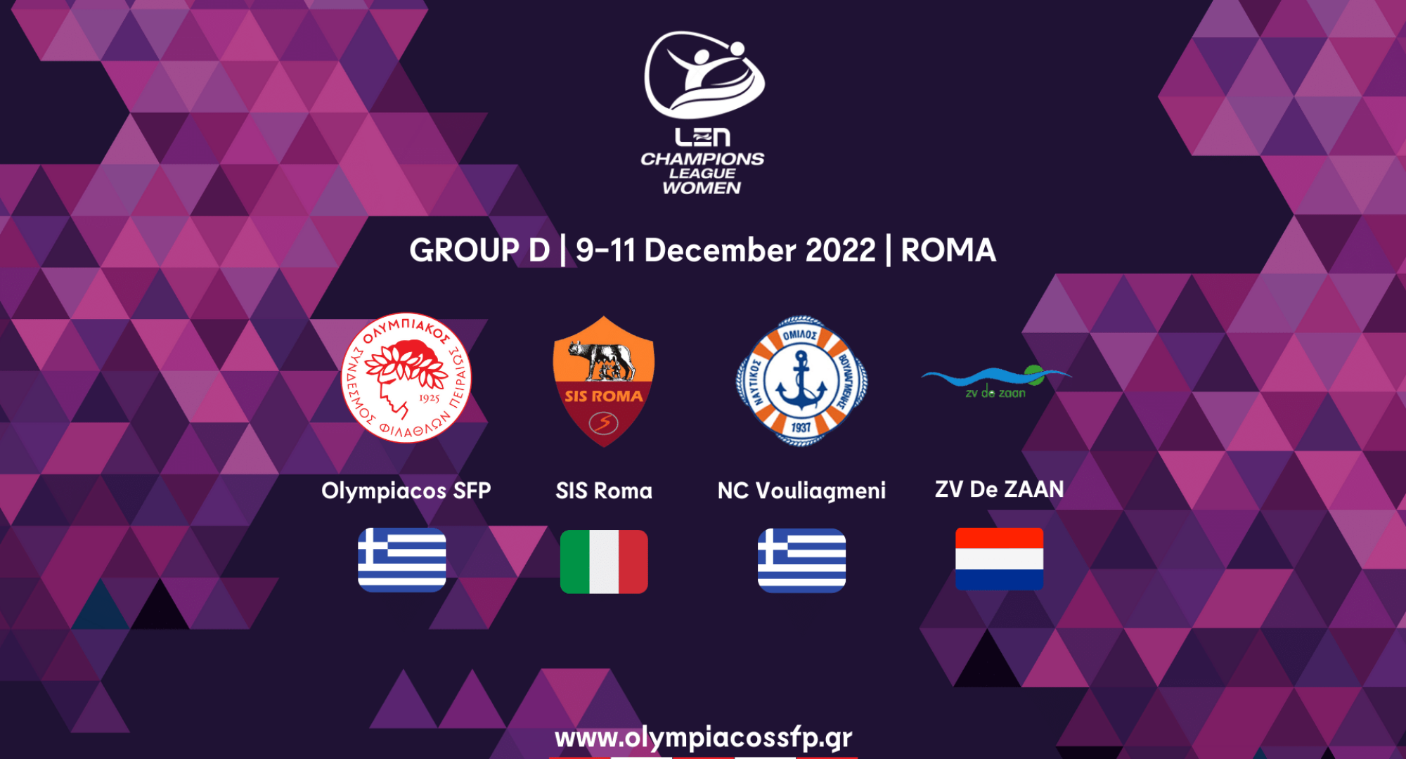 Αρχικά ο Ολυμπιακός θα αντιμετωπίσει την Ολλανδική ZV De Zaan, την Παρασκευή (9/12) στις 18:00, το Σάββατο (10/12) στις 20:00 θα ακολουθήσει η αναμέτρηση με τη Βουλιαγμένη και την Κυριακή (11/12) στις 13:00 θα αναμετρηθεί με την διοργανώτρια του ομίλου, Ρόμα.