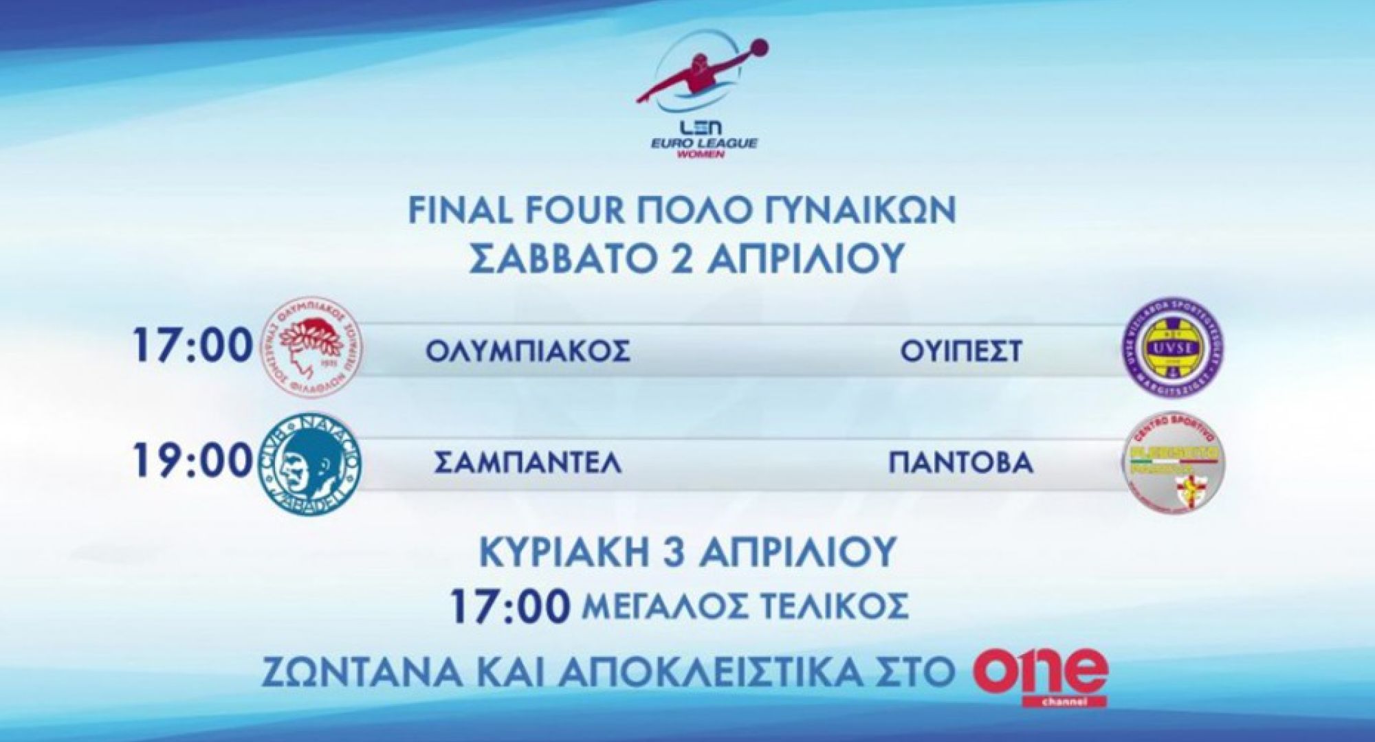 Τo Final Four της Euroleague στο πόλο γυναικών παίζει ζωντανά και αποκλειστικά στο ONE Channel. Το Σάββατο 2 και την Κυριακή 3 Απριλίου. O πρωταθλητής Ευρώπης Ολυμπιακός διεκδικεί στο «Παπαστράτειο» το ιστορικό back to back, την τρίτη Euroleague και το έκτο συνολικά ευρωπαϊκό του τρόπαιο.