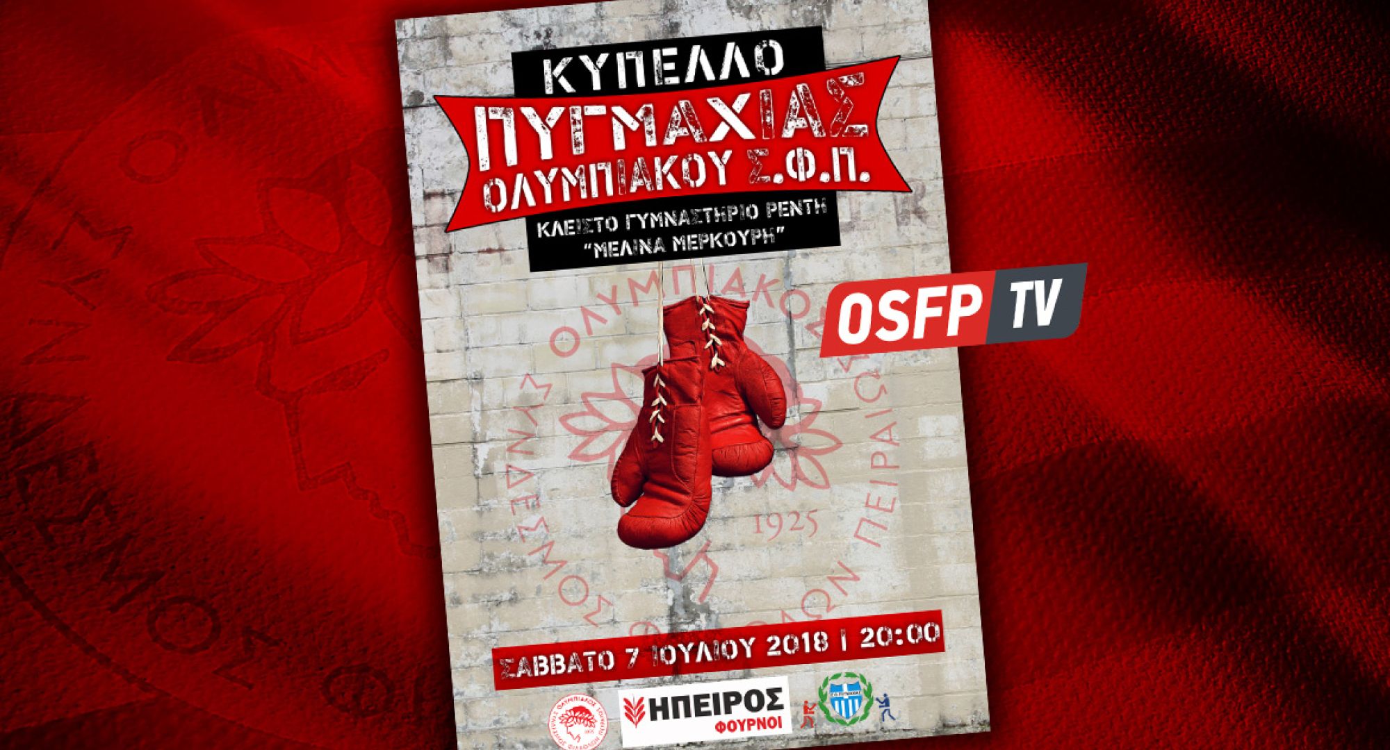 Η αντίστροφη μέτρηση για τη διεξαγωγή του 1ου Κυπέλλου Πυγμαχίας «Ολυμπιακός Σ.Φ.Π.», το οποίο θα διεξαχθεί το Σάββατο 7 Ιουλίου 2018 στο Κλειστό Γυμναστήριο Ρέντη «Μελίνα Μερκούρη» με ώρα έναρξης στις 19:00 έχει ξεκινήσει. Οι αγώνες που διοργανώνει ο σύλλογός μας θα διεξαχθούν υπό την αιγίδα της Ε.Ο.Π. και ήδη έχουν δηλώσει συμμετοχή σύλλογοι από όλη την Ελλάδα. Όλες οι αναμετρήσεις της διοργάνωσης θα μεταδοθούν ζωντανά από το OSFP.TV, το επίσημο κανάλι του Ολυμπιακού στο Youtube. Βάσει του προγράμματος το οποίο καταρτίζεται θα πραγματοποιηθούν 18-20 αγώνες και ο σύλλογός μας θα λάβει μέρος με αθλητές από την αγωνιστική ομάδα αλλά και τις Ακαδημίες.