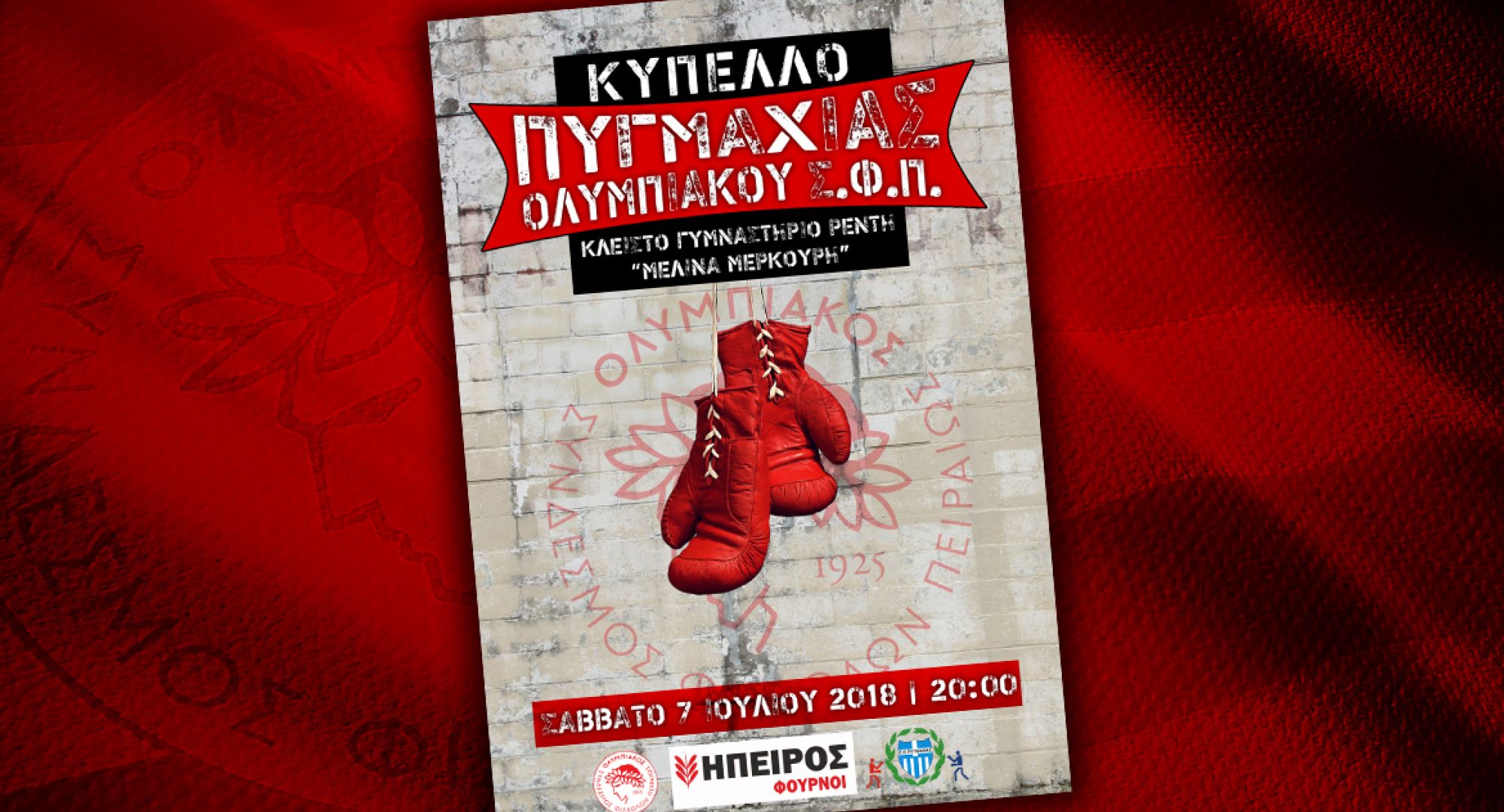 Ο ΟΛΥΜΠΙΑΚΟΣ Σ.Φ.Π., θα διοργανώσει το Κύπελλο Πυγμαχίας, υπό την αιγίδα της Ε.Ο.Π. το οποίο θα πραγματοποιηθεί το Σάββατο 7 Ιουλίου 2018 στο Κλειστό Γυμναστήριο Ρέντη «Μελίνα Μερκούρη» με ώρα έναρξης στις 19:00 . Περισσότερες πληροφορίες σχετικά με τη διοργάνωση θα ανακοινωθούν το επόμενο διάστημα.