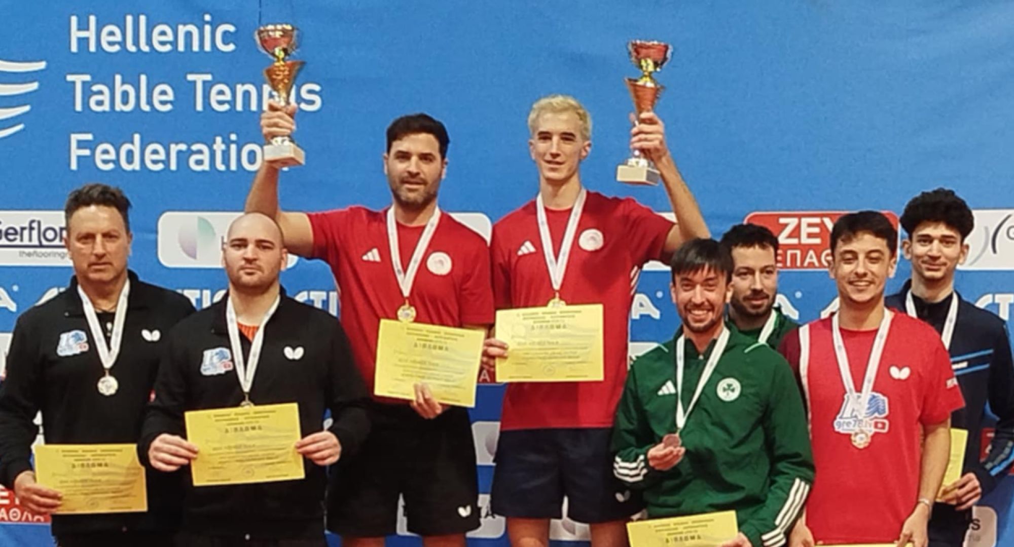 Στο διπλό Ανδρών, πρωταθλητές Ελλάδας αναδείχθηκαν οι Τάσος Ρηνιώτης και Σταματούρος του Θρύλου, κατακτώντας τον τρίτο τους τίτλο ως δίδυμο! Οι αθλητές του Ολυμπιακού αντιμετώπισαν τους Σγουρόπουλο και Γιάννη Βλοτινό στον τελικό, στο Στάδιο Ειρήνης και Φιλίας, επικράτησαν με 3-1 σετ και κατέκτησαν την πρώτη θέση στο Πανελλήνιο πρωτάθλημα.