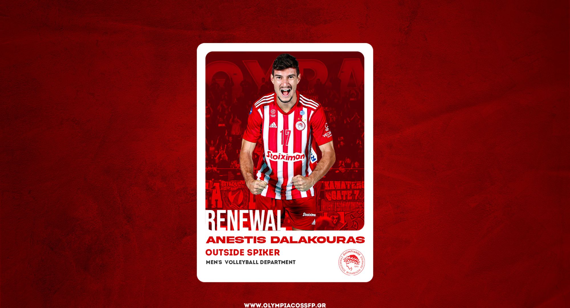 Ο ΟΛΥΜΠΙΑΚΟΣ Σ.Φ.Π. ανακοινώνει την ανανέωση της συνεργασίας του με τον Ανέστη Δαλακούρα. Ο διεθνής ακραίος υπέγραψε το νέο του συμβόλαιο και παραμένει στο ρόστερ της ομάδας βόλεϊ Ανδρών του συλλόγου.