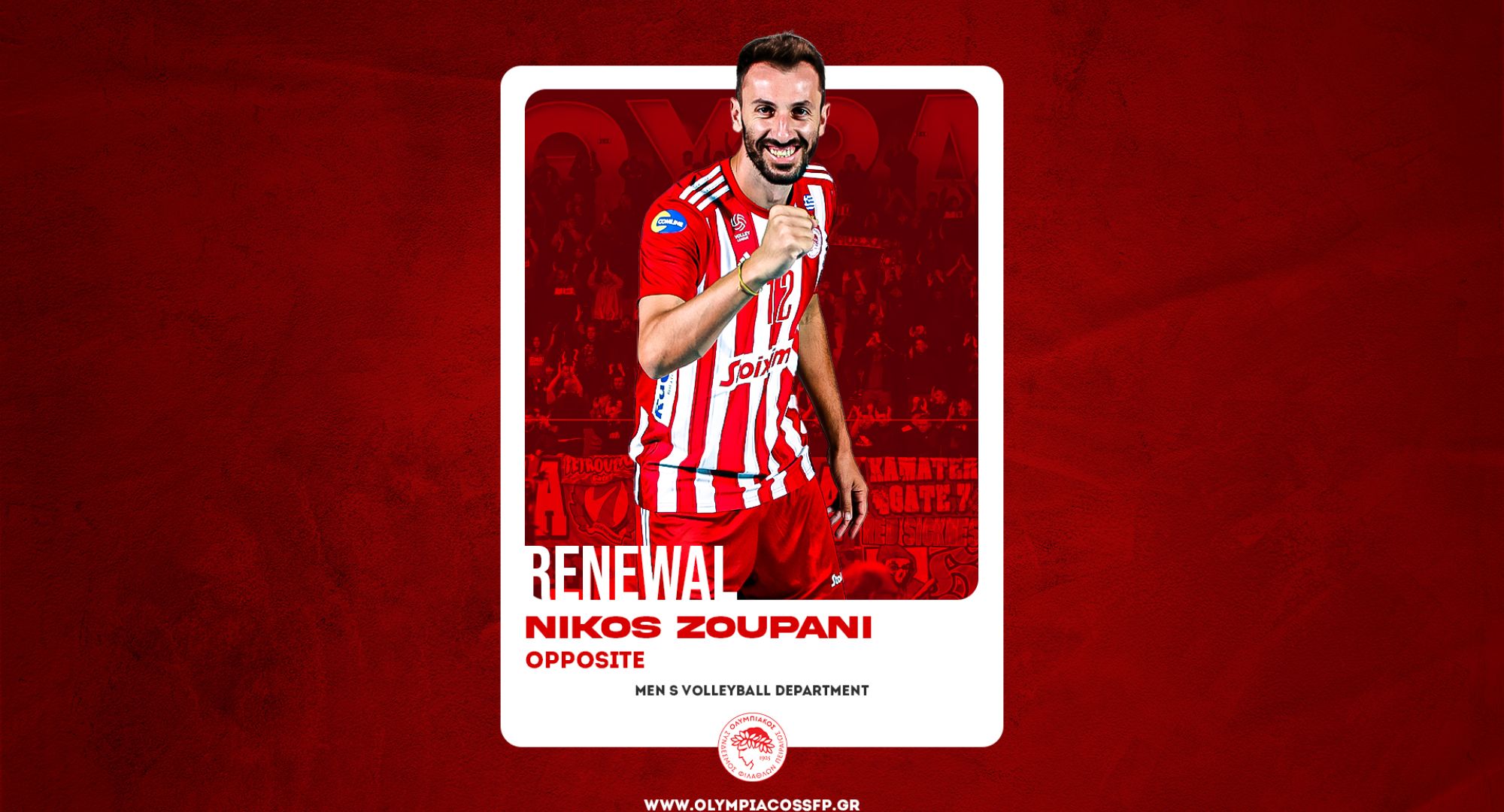 Ο ΟΛΥΜΠΙΑΚΟΣ Σ.Φ.Π. ανακοινώνει την ανανέωση της συνεργασίας του με τον Νίκο Ζουπάνη. Ο διεθνής διαγώνιος υπέγραψε το νέο του συμβόλαιο και παραμένει στο ρόστερ της ομάδας βόλεϊ Ανδρών του συλλόγου.