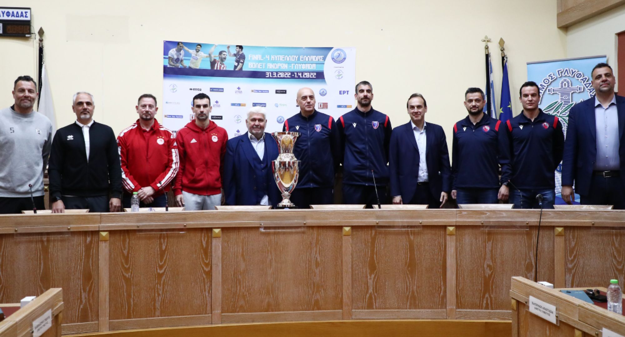 Πραγματοποιήθηκε στο Δημαρχείο Γλυφάδας η συνέντευξη Τύπου του Final-4 του Κυπέλλου Ελλάδας, που θα διεξαχθεί (31/3-1/4) στο κλειστό «Μάκης Λιούγκας» με τη συμμετοχή της ομάδας βόλεϊ Ανδρών του Ολυμπιακού, του Πήγασου Πολίχνης, του Φοίνικα Σύρου και του ΠΑΟΚ. Στη συνέντευξη Τύπου στη Γλυφάδα, από πλευράς Ολυμπιακού μίλησαν ο προπονητής, Αλμπέρτο Τζουλιάνι και ο αρχηγός, Κώστας Στιβαχτής, ενώ το «παρών» έδωσαν ο τιμ μάνατζερ, Νίκος Μαντούβαλος και ο βοηθός προπονητή, Αντώνης Βουρδέρης.