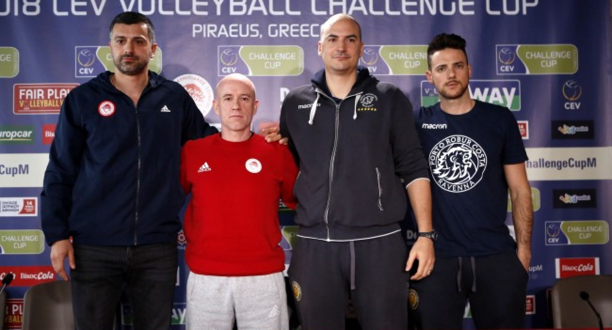 Πραγματοποιήθηκε σήμερα το απόγευμα στο Στάδιο Ειρήνης και Φιλίας η επίσημη Συνέντευξη Τύπου του δεύτερου τελικού του CEV Challenge Cup των Ανδρών μεταξύ του Ολυμπιακού και της Ιταλικής Ραβέννα. Από πλευράς «ερυθρολεύκων» το παρών έδωσαν ο προπονητής Φερνάντο Μουνιόθ Μπενίτεθ και ο αρχηγός Κώστας Χριστοφιδέλης και από την Ιταλική ομάδα ο προπονητής της, Σόλι Φάμιο και ο αρχηγός, Σαντιάγκο Ορντούνα.