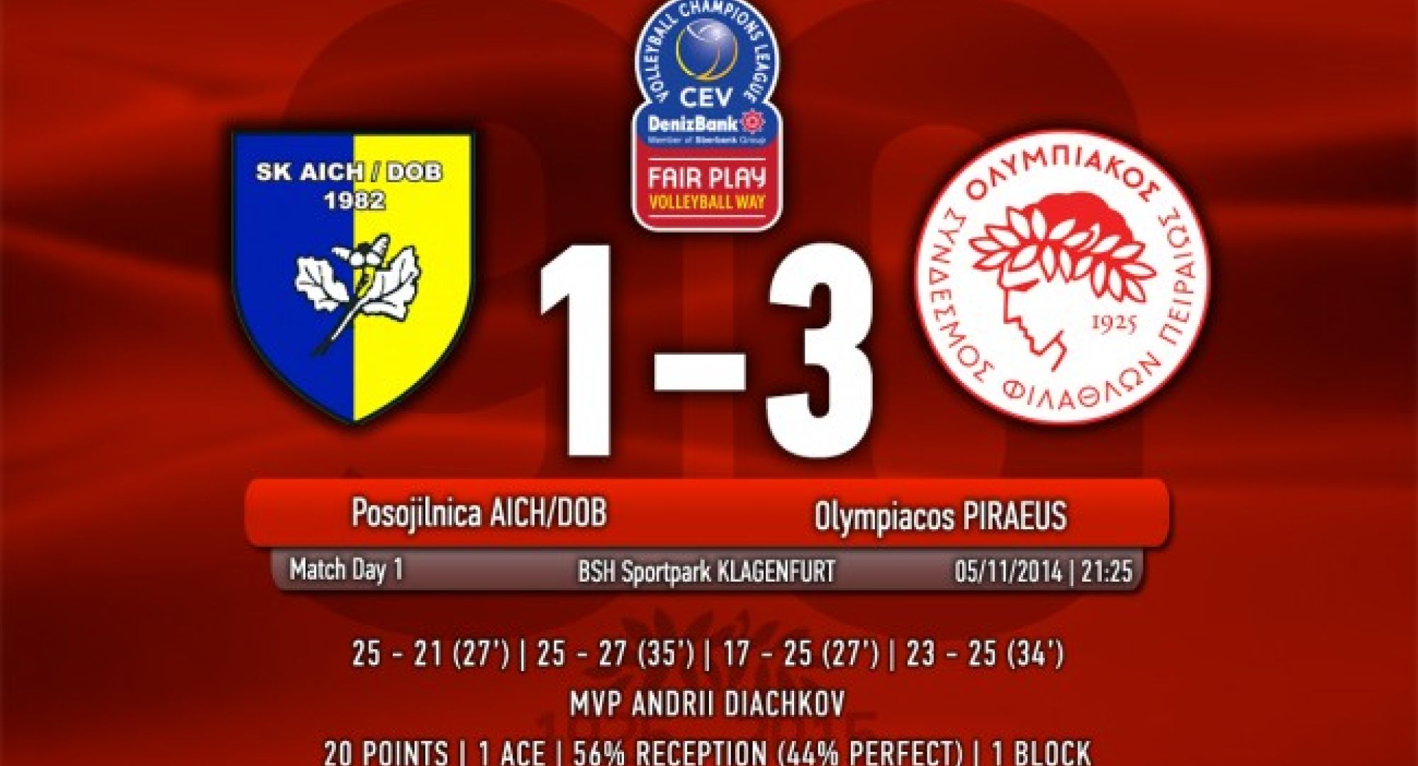 Μεγάλη νίκη για τον αυτοκράτορα του Ελληνικού βόλεϊ μέσα στην Αυστρία επί της Posojilnica Aich/Dob στην πρεμιέρα του CEV DenizBank Volleyball Champions League. Oι ερυθρόλευκοι με πολύ καλή εμφάνιση ειδικά από το δεύτερο σετ και μετά, νίκησαν με 1-3 σετ τους Αυστριακούς και έδειξαν με το καλημέρα ότι και φέτος θα είναι άκρως ανταγωνιστικοί στην κορυφαία διοργάνωση της Ευρώπης.