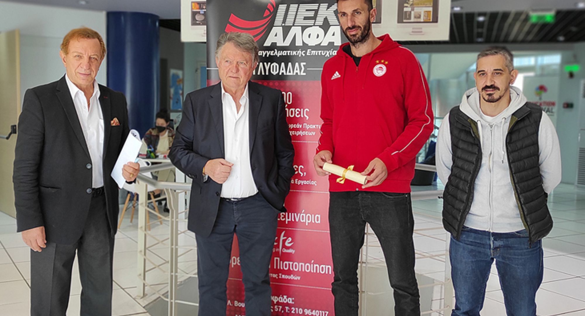Ο αθλητής του Ολυμπιακού, Νίκος Ζουπάνη, κατά την παραλαβή της υποτροφίας από τον κ. Σοφοκλή Ξυνή, που έγινε παρουσία του Διευθυντή Επικοινωνίας και Αθλητικού τομέα του ΙΕΚ ΑΛΦΑ κ. Αντώνη Γλύκα και του Υπεύθυνου Τύπου του συλλόγου μας, Κώστα Δελεχά, δήλωσε : «Θα ήθελα να ευχαριστήσω προσωπικά τον κ. Σοφοκλή Ξυνή για αυτή την υποτροφία, καθώς μου δίνεται η ευκαιρία να εκπαιδευτώ, ώστε να χτίσω το μέλλον μου. Τα ΙΕΚ ΑΛΦΑ δείχνουν στην πράξη την υποστήριξη σε όσους αθλητές δεν κατάφεραν να σπουδάσουν νωρίτερα, λόγω επαγγελματικών υποχρεώσεων και συμμετοχών σε εθνικές ομάδες και στηρίζει την προσπάθεια τους, αποδεικνύοντας πως η εκπαίδευση δεν σταματά ποτέ και έχει πάντα την ευκαιρία να θέσεις νέους στόχους! Είμαι ιδιαίτερα ευγνώμων, διότι μαζί με τη στήριξη του Ολυμπιακού, εγώ και πολλοί συναθλητές μου μπορούμε να επενδύσουμε στο μέλλον μας, μετά την ολοκλήρωση της αγωνιστικής μας δράσης».