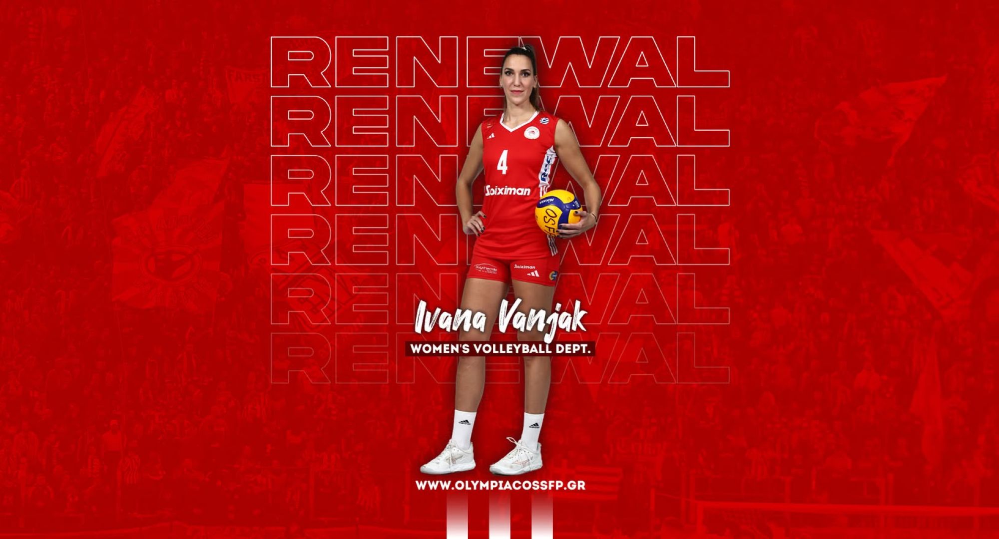 Ο ΟΛΥΜΠΙΑΚΟΣ Σ.Φ.Π. ανακοινώνει την ανανέωση της συνεργασίας του με την Ιβάνα Βάνιακ. Η Γερμανίδα ακραία υπέγραψε το νέο της συμβόλαιο, μονοετούς διάρκειας και παραμένει στο ρόστερ της ομάδας βόλεϊ Γυναικών του συλλόγου.
