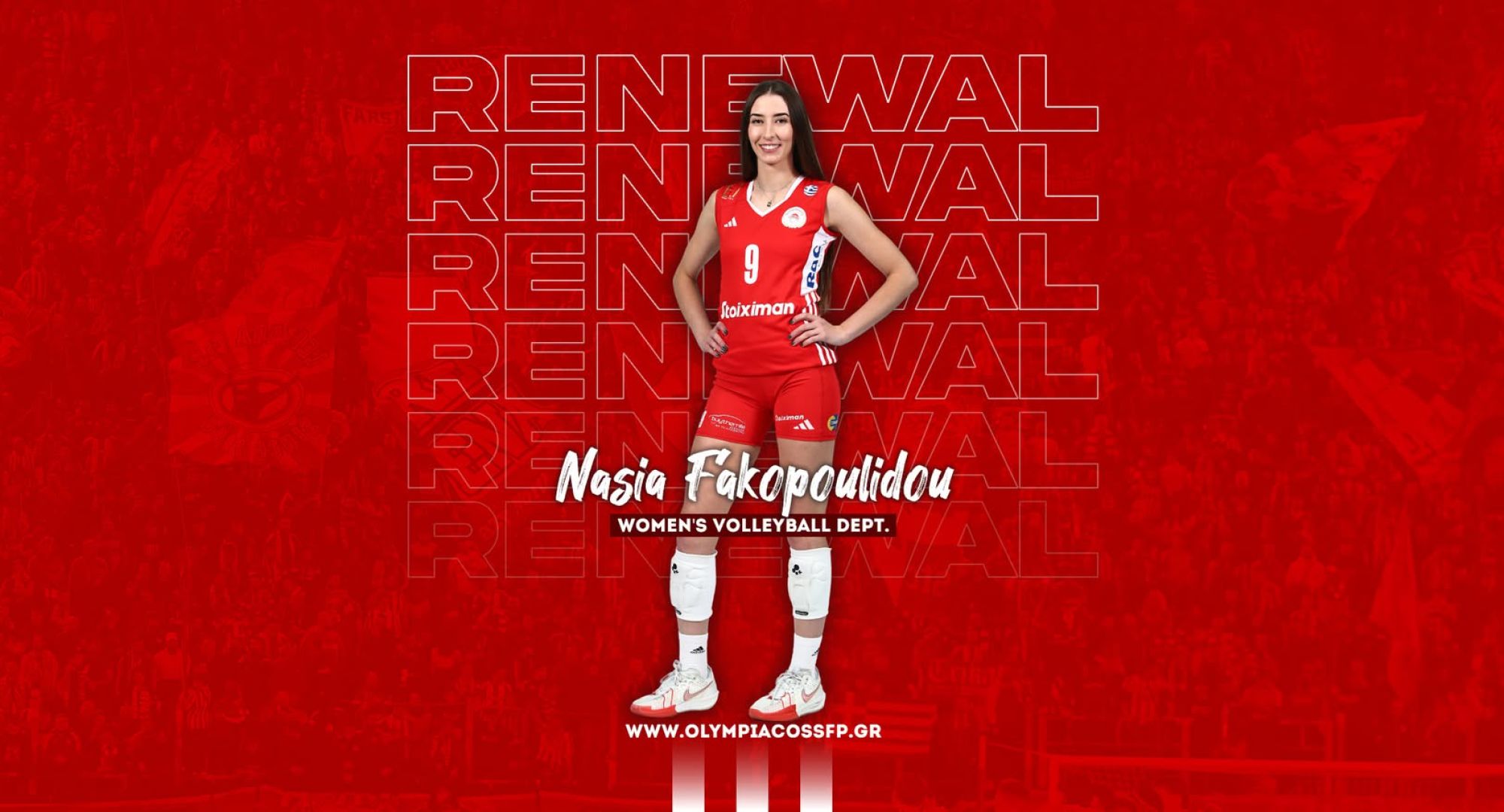 Ο ΟΛΥΜΠΙΑΚΟΣ Σ.Φ.Π. ανακοινώνει την ανανέωση της συνεργασίας του με την Νάσια Φακοπουλίδου. Η Ελληνίδα ακραία υπέγραψε το νέο της συμβόλαιο, μονοετούς διάρκειας και παραμένει στο ρόστερ της ομάδας βόλεϊ Γυναικών του συλλόγου.