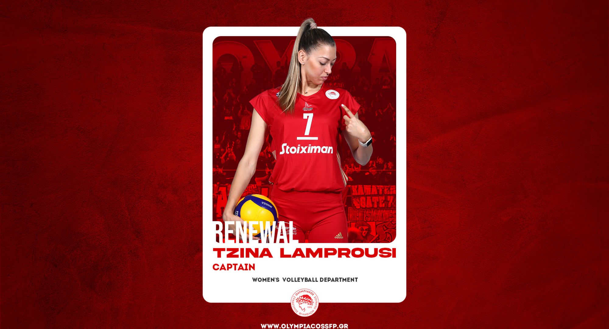 Ο ΟΛΥΜΠΙΑΚΟΣ Σ.Φ.Π. ανακοινώνει την ανανέωση της συνεργασίας του με την Τζίνα Λαμπρούση. Η αρχηγός και Ελληνίδα κεντρική υπέγραψε το νέο της συμβόλαιο και παραμένει στο ρόστερ της ομάδας βόλεϊ Γυναικών του συλλόγου.