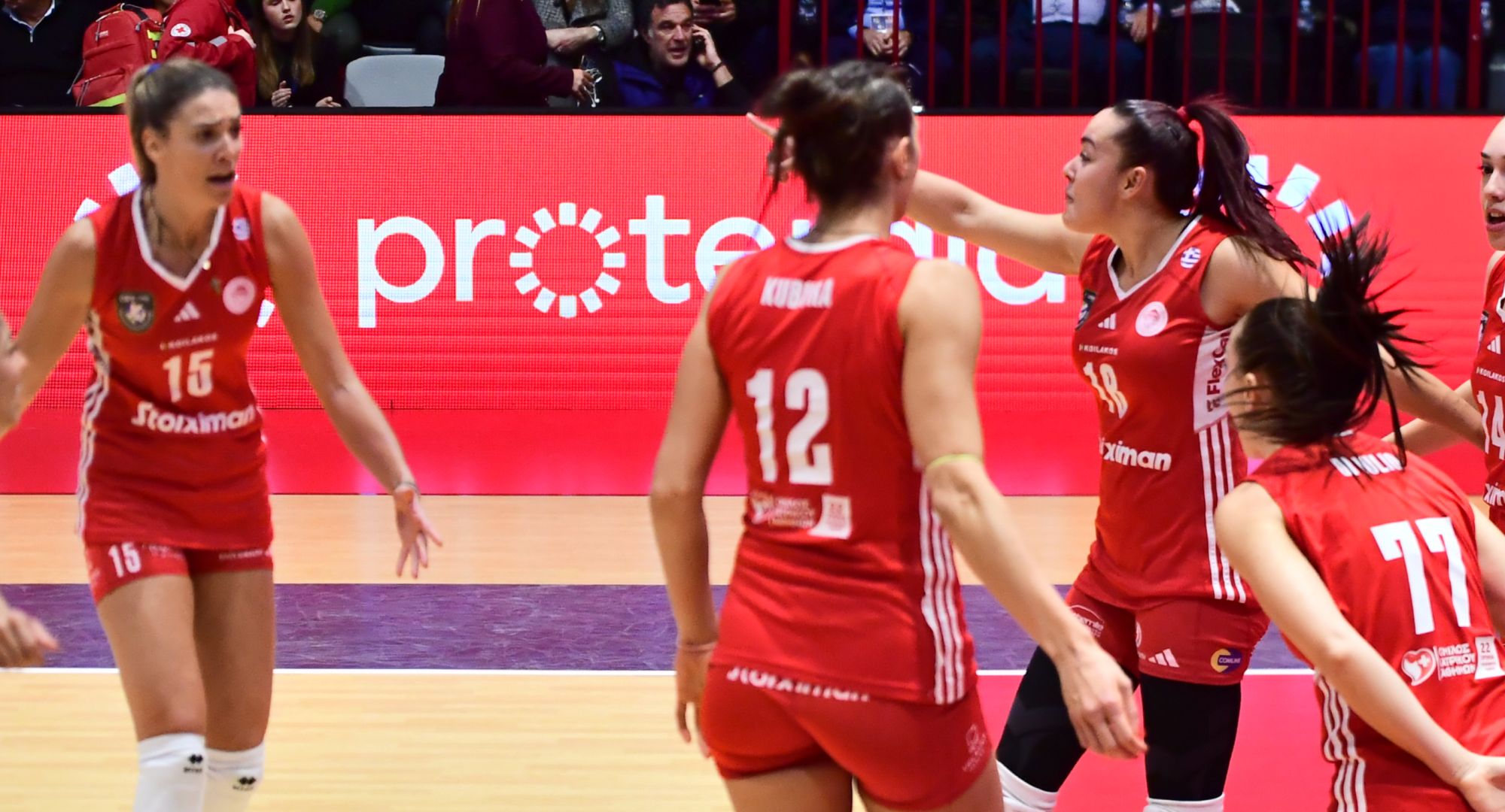 Πιο αναλυτικά, στο πρώτο σετ, ο Ολυμπιακός βρέθηκε πίσω με 9-6, 11-8 και 13-10, αλλά μείωσε σε 13-12, με επιθέσεις των Κούμπουρα και Τερζόγλου. Οι «ερυθρόλευκες» έμειναν ξανά πίσω με τρεις πόντους (12-15, 13-16, 14-17), αλλά κατάφεραν και ισοφάρισαν σε 21-21, με εξαιρετικό μπλοκ της Κονέο. Οι τυπικά φιλοξενούμενες, ωστόσο, έφτασαν στην κατάκτηση του σετ (0-1), με 25-22.