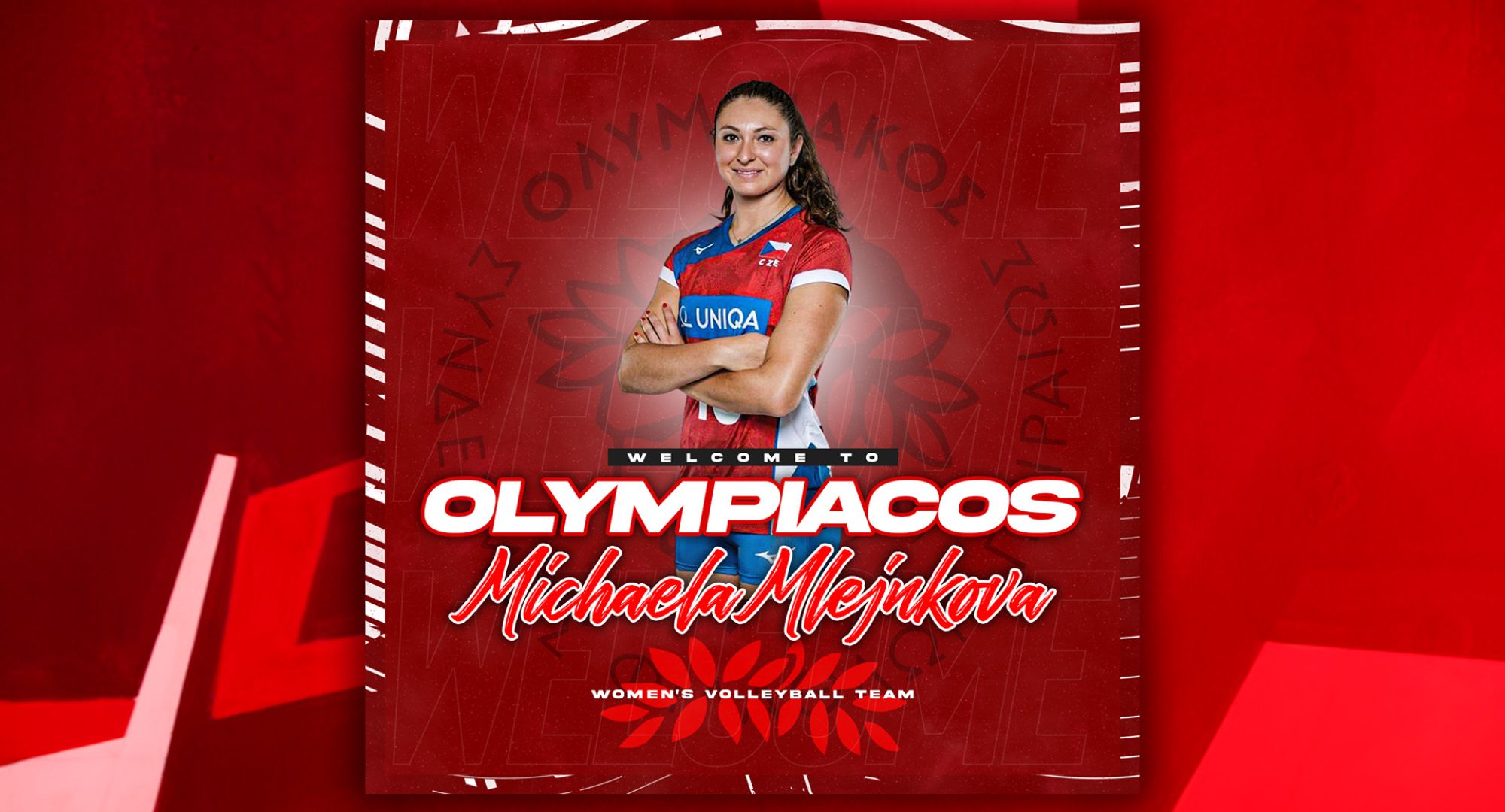 Η δήλωση της Μικαέλα Μλέινκοβα στο olympiacossfp.gr: «Είναι τιμή μου, που θα μπορέσω να υπερασπιστώ τα χρώματα του Ολυμπιακού τη νέα σεζόν. Ο Ολυμπιακός είναι ένας καταπληκτικός σύλλογος με μεγάλη ιστορία και ανυπομονώ, πραγματικά, να γίνω μέρος της μεγάλης οικογένειας του».